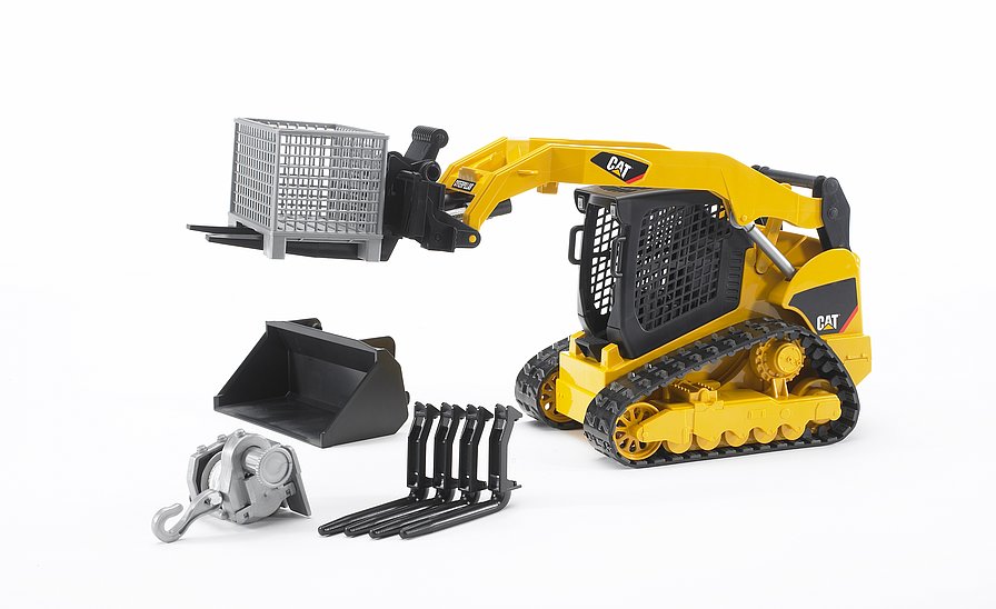 Der Cat® Kompaktkettenlader 277C ist ein wahres Multitalent. Kraftvoll, flexibel und wendig ist er auf jedem kleineren Terrain die erste Wahl. Die Funktionen des Kompaktkettenladers sind vergleichbar mit denen des Cat® Kompaktladers, jedoch besitzt der Kompaktkettenlader ein Gummiketten-Laufwerk, durch das ein deutlich niedrigerer Bodendruck entsteht. Besonders beim Spielen macht es große Freude, den präzise arbeitenden Ketten zuzusehen, während man den Kompaktkettenlader über die unterschiedlichsten Flächen bewegt. Der bewegliche Arm des Kompaktkettenladers kann in mehreren Positionen eingerastet werden und aufgrund einer speziellen Konstruktionsweise eine besonders hohe Ladehöhe erreichen. Durch einen bereits bei mehreren BRUDER-Fahrzeugen verwendeten Adapter für Anbaugeräte, können mit dem Kompaktkettenlader und dem Zubehör innerhalb kürzester Zeit unterschiedlichste Arbeitsvorgänge bewältigt werden.