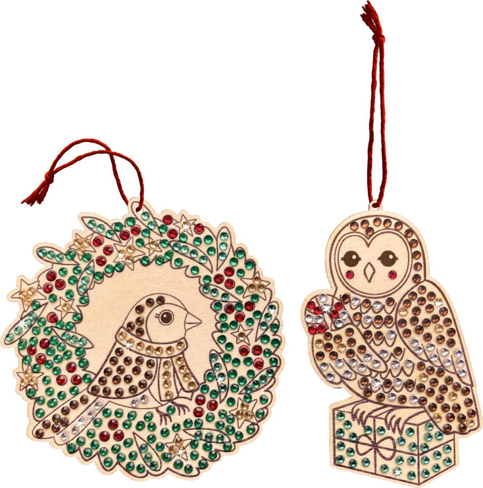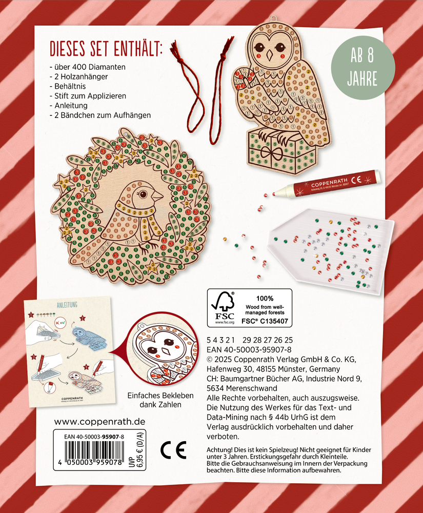 - Beigaben: in bedruckter Kartonverpackung (13 x 16 x 1,5 cm) mit 2 Holzanhängern, Diamonds, Stift zum Applizieren, Behältnis und Anleitung