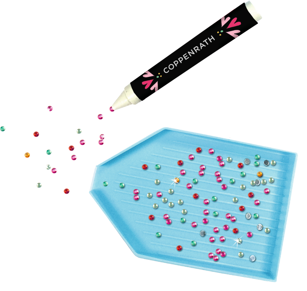 - Diamanten aus Kunststoff, Motivkarten aus stabilem Karton mit selbsthaftender Oberfläche.