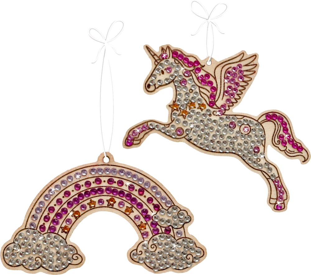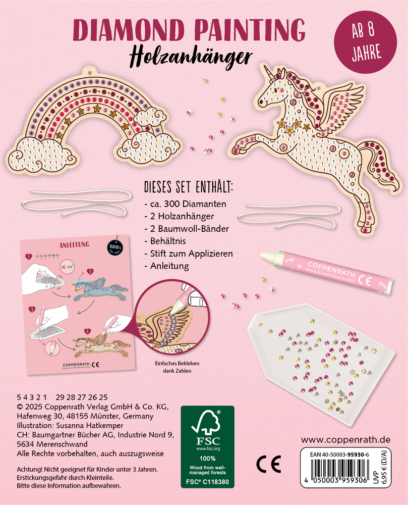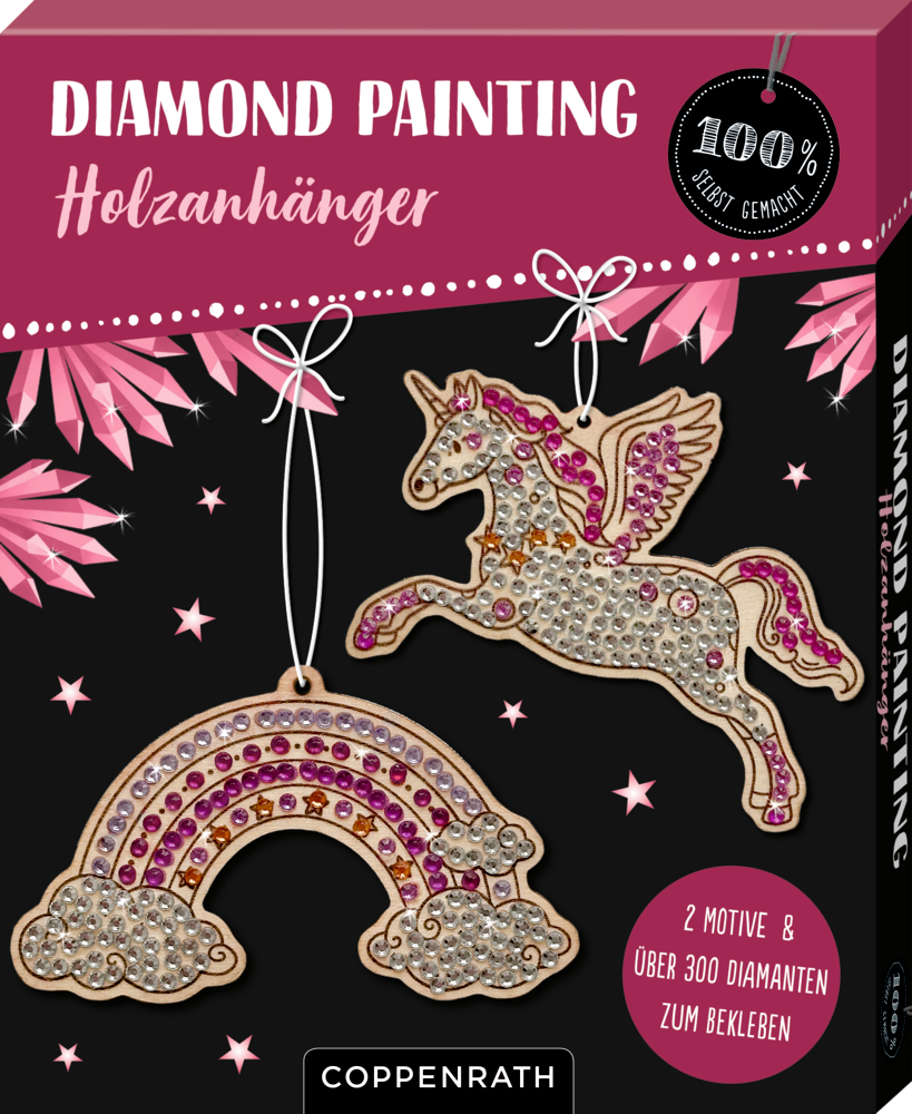 - Beigaben: in bedruckter Kartonverpackung (13 x 16 x 1,5 cm) mit 2 Holzanhängern, 2 Bändchen, Diamanten, 1 Behältnis, 1 Stift zum Applizieren und Anleitung