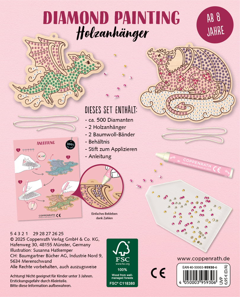 - Beigaben: in bedruckter Kartonverpackung (13 x 16 x 1,5 cm) mit 2 Holzanhängern, 2 Bändchen, Diamanten, 1 Behältnis, 1 Stift zum Applizieren und Anleitung
