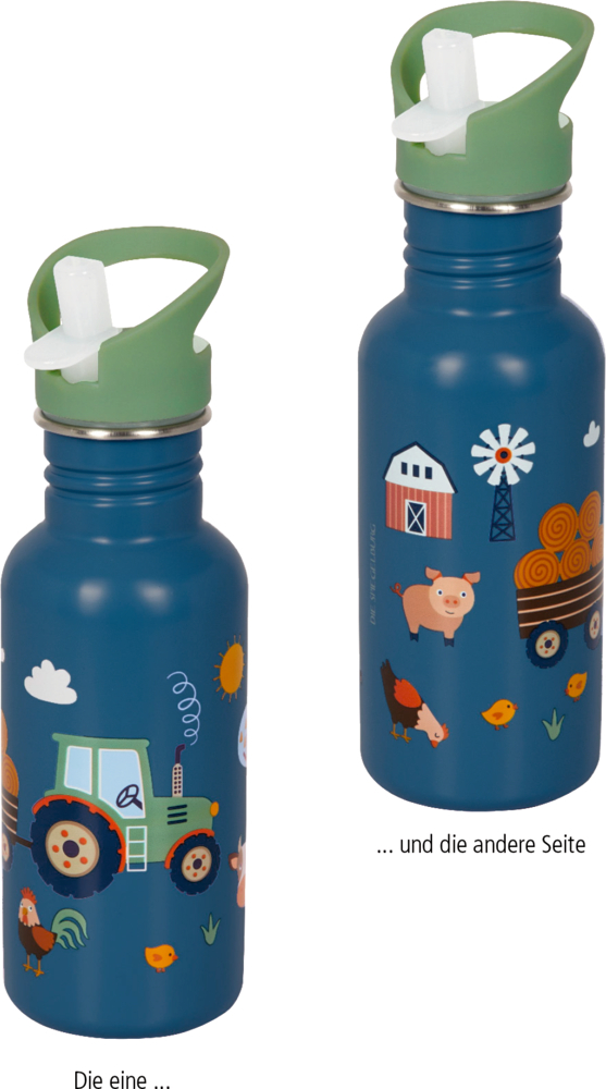 Diese praktische Trinkflasche von Die Spiegelburg bietet mit einem Fassungsvermögen von ca. 0,5 Litern ausreichend Platz für die Durstlöscher kleiner und großer Bauernhof-Fans. Die Trinkflasche ist aus hochwertigem und strapazierfähigem Edelstahl gefertigt und somit ideal für den täglichen Einsatz in Kindergarten, Schule oder beim Ausflug in die Natur. Mit buntem Traktor-Motiv, einem leicht zu öffnenden Deckel und einer Reinigungsbürste, um kinderleicht den Flaschenhals gründlich reinigen und mögliche Rückstände entfernen zu können. Einfach abspülen und die Flasche ist wieder einsatzbereit für den nächsten Tag in Kindergarten oder Schule.