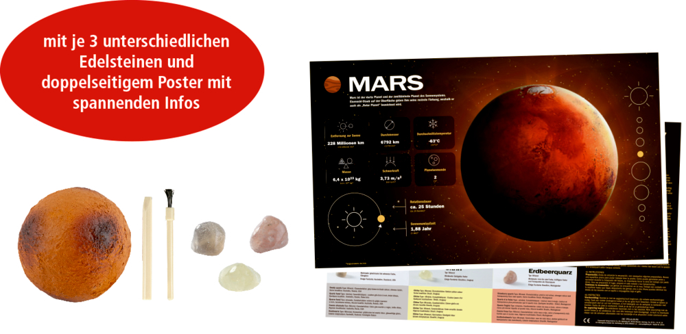 Maße/ Gewicht/ Inhalt: Planet: ca. Ø 8 cm, Poster: ca. 45 x 27 cm / Verpackung: 10 x 14 x 10 cm