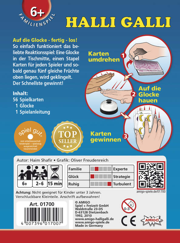 Da haben wir den Salat! Ein großer Fruchtcocktail mit Bananen, Erdbeeren, Limonen und Pflaumen – das ist Halli Galli. Schnelligkeit und ein gutes Auge sind hier Trumpf. Sobald die Spieler fünf gleiche Früchte auf den ausgespielten Karten entdecken, schlagen sie schnell auf die Glocke. Aber nur bei genau fünf Früchten, also aufgepasst! Wer am Ende die meisten Karten „erklingelt“ hat, ist Sieger.