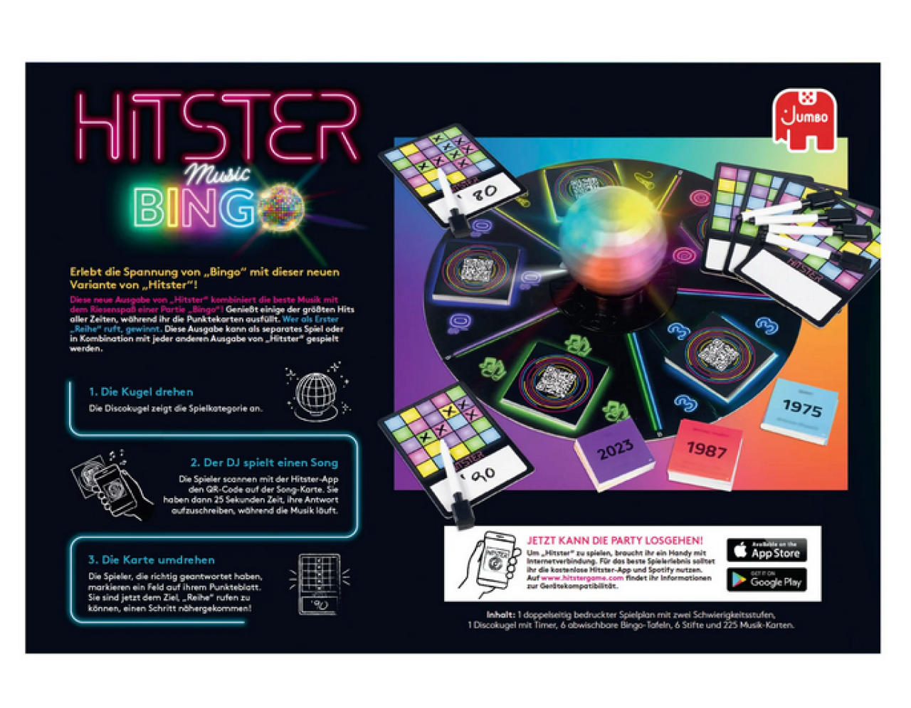 Hitster Bingo vereint das beste Party Spiel aller Zeiten mit Bingo. Mache dich bereit, die Discokugel zu drehen und zu den Beats in Hitster Bingo zu grooven! Drehe die Discokugel, um die Kategorie aufzudecken, scanne die Karte und lass die Musik spielen. Errate das Jahrzehnt, identifiziere Sänger oder Bands, wähle das genaue Jahr oder bestimme, ob es vor oder nach den 2000ern ist. Wer als Erster eine Reihe oder Spalte mit den vier verschiedenen Kategorien vervollständigt, wird zum Hitster-Bingo-Champion gekrönt!