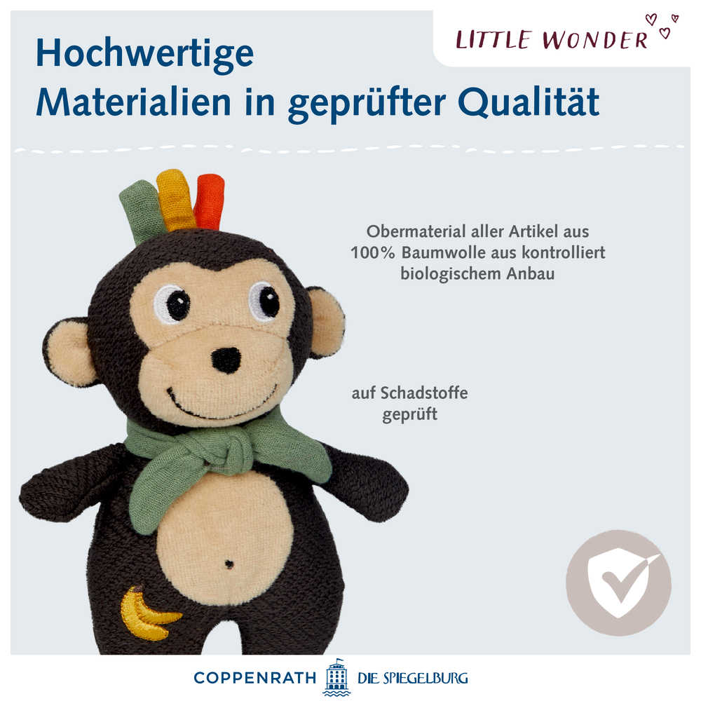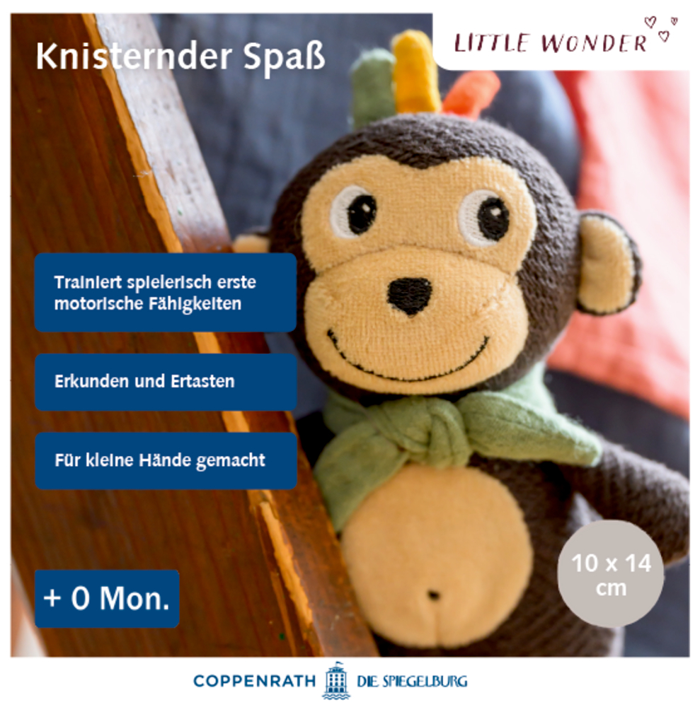 Verspieltes Greifen und Staunen! Das Knistertier Affe aus der „Little Wonder“-Kollektion von Die Spiegelburg lädt mit einer Größe von ca. 10 x 14 cm kleine Hände zum Erkunden erster Geräusche und Strukturen ein. Der Knisterspaß fördert nicht nur Sinne und Neugier, auch die Greifreflexe werden spielerisch entwickelt. Handspülung empfohlen.