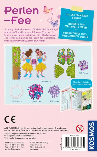 Wie wunderschön die selbst gebastelten Perlen-Flügel dieser Fee sind! Moment mal, haben die Perlen gerade die Farbe gewechselt!? Dieser verblüffende Effekt tritt auf, wenn die Fee in Sonnenlicht getaucht wird. Doch vorher muss sie erst einmal gebastelt werden! Kinder zwischen 6 und 10 Jahren lernen die spezielle Perlen-Fädeltechnik, um die Flügel zu konstruieren. So gestalten sie die niedliche Fee mit pinken, blauen und den besonderen UV-Perlen, die sich im Sonnenlicht von weiß zu lila färben. Dazu lernen die Kinder in der Anleitung Vieles über UV-Strahlen und Farbwechselphänomene in der Natur. Was fehlt da noch? Ach ja, richtig! Zu der Fee gehört ihr Freund - ein tolles Chamäleon, dessen mit Perlen geschmückter Schwanz im Sonnenlicht kunterbunt erstrahlt. Ein KOSMOS Experimentierset zum Basteln und mit Überraschungs-Effekt!