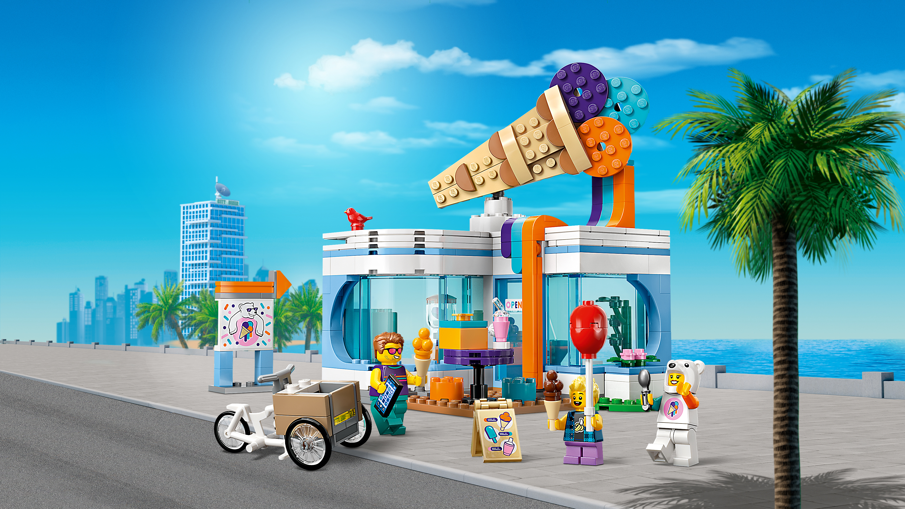 Diese LEGO® City Eisdiele (60363) für Kinder ab 6 Jahren bringt echte Sommerstimmung ins Kinderzimmer. Wer Eisdielen und Partys liebt, wird von diesem tollen Spielset mit Eistheke, Mixer, Kühlschrank und Sitzplätzen im Freien begeistert sein. Auch ein Lastenfahrrad und 3 Minifiguren laden zum Spielen ein. Der Eisverkäufer trägt übrigens ein lustiges Eisbärkostüm. Mit digitalen Bauanleitungen Zu diesem Set ist neben einer verständlichen Bildanleitung auch eine intuitive Schritt-für-Schritt-Anleitung in der LEGO Builder App verfügbar. Digitale Funktionen lassen dein Kind beim Bauen virtuelle Modellansichten vergrößern, drehen und näher betrachten. Mithilfe der App kann dein Kind aber auch seinen Baufortschritt verfolgen sowie virtuelle Spielsets erkunden und speichern. Die Welt ganz spielerisch entdecken LEGO City Spielsets bieten unzählige Spielmöglichkeiten mit detailreichen Bauwerken, realistischen Fahrzeugen und faszinierenden Figuren für fantasievolle Rollenspiele, die den Alltag auf spannende Weise widerspiegeln.