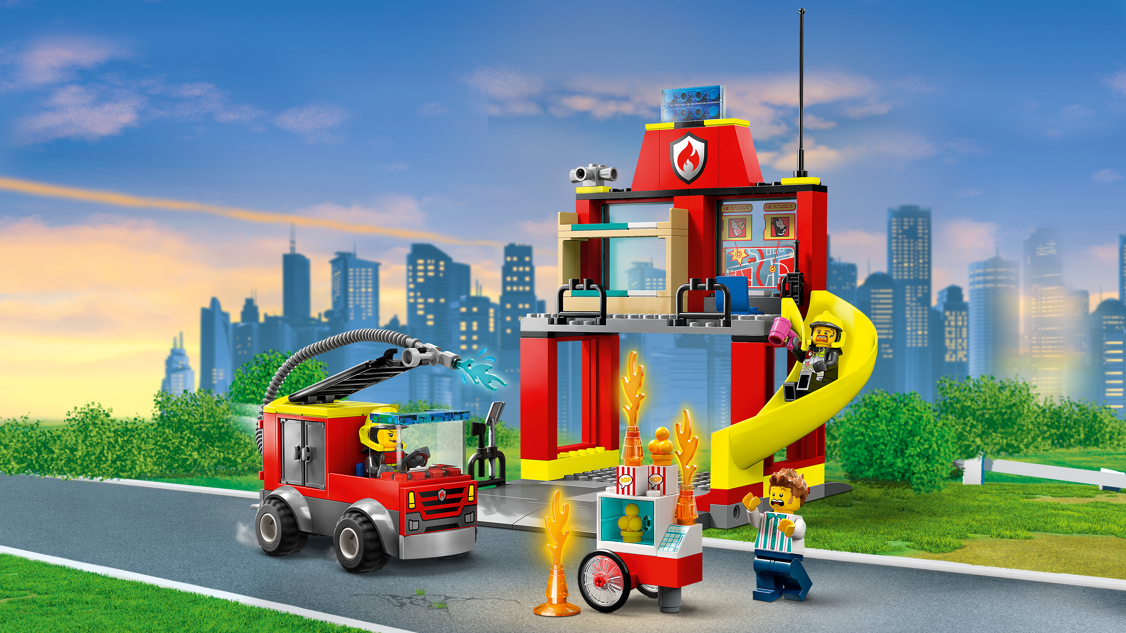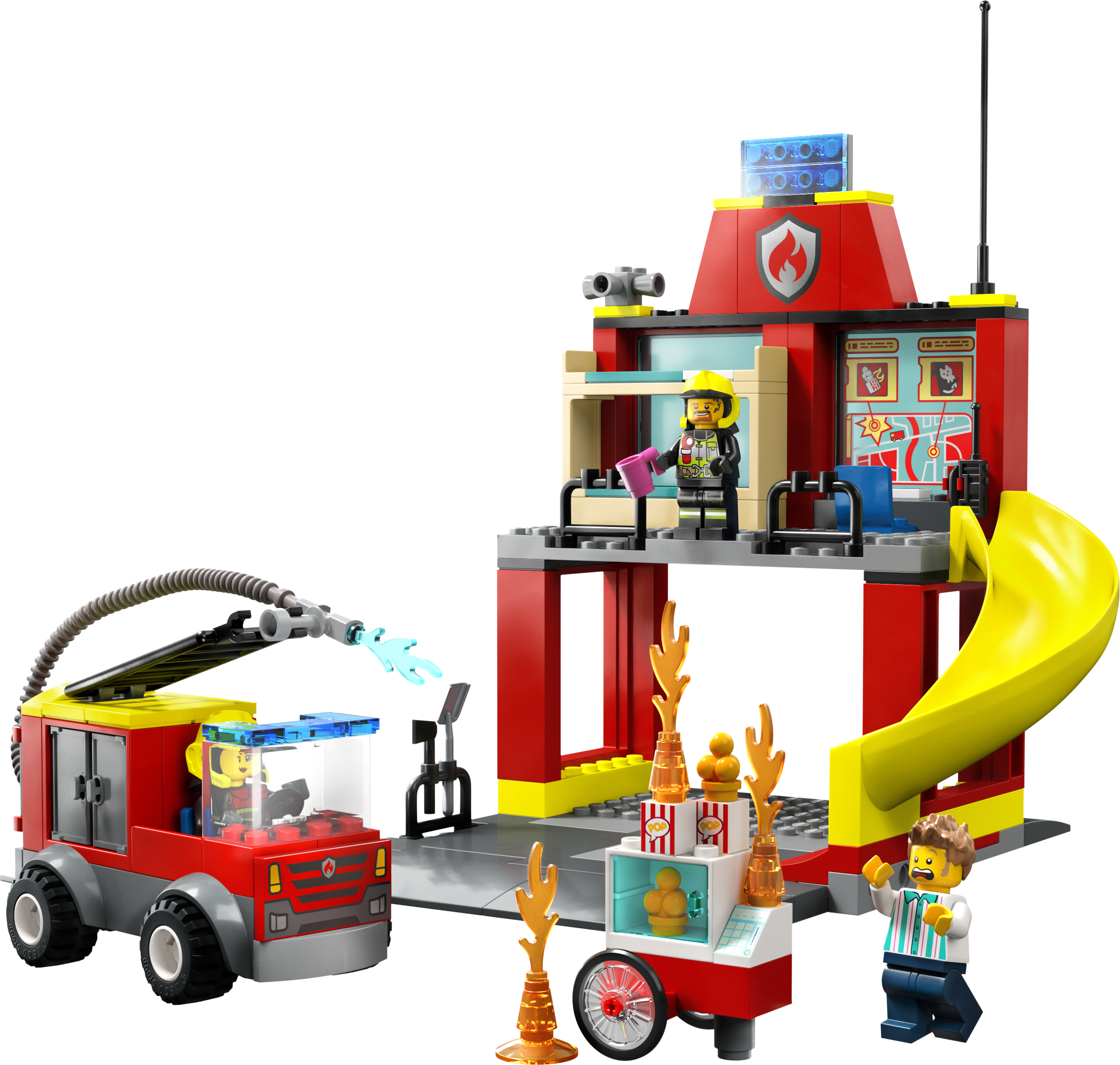 • Inhalt der Box: Alles, was du brauchst, um eine Feuerwehrstation und ein Löschauto zu bauen, sowie ein Popcornwagen, LEGO® Flammen und 3 Minifiguren – ein Verkäufer und 2 Feuerwehrleute