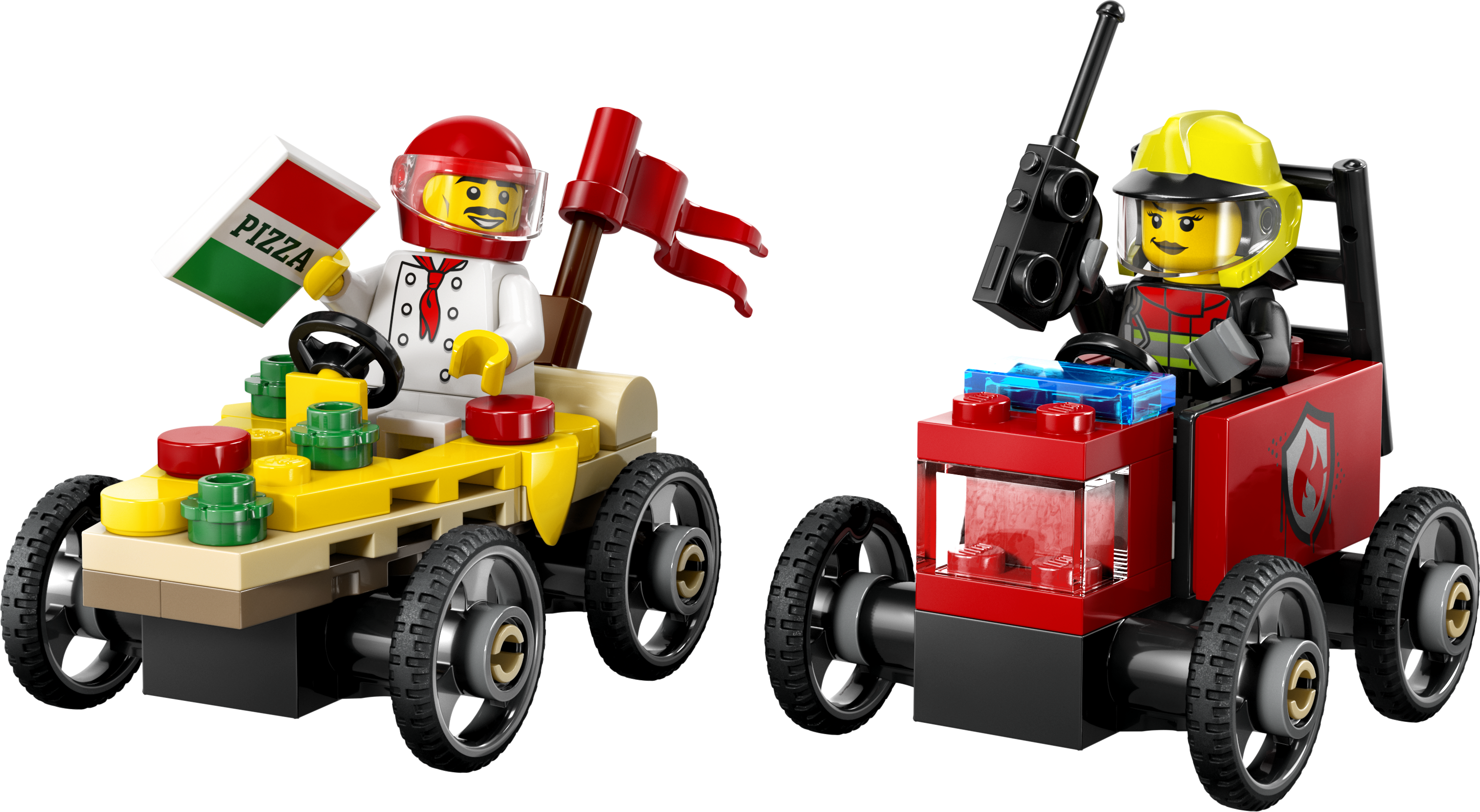 • Spielset für spannende Seifenkistenrennen: Überrasche einen jungen Rennsportfan mit LEGO® City Pizzalieferwagen vs. Löschauto für Kinder ab 5 Jahren