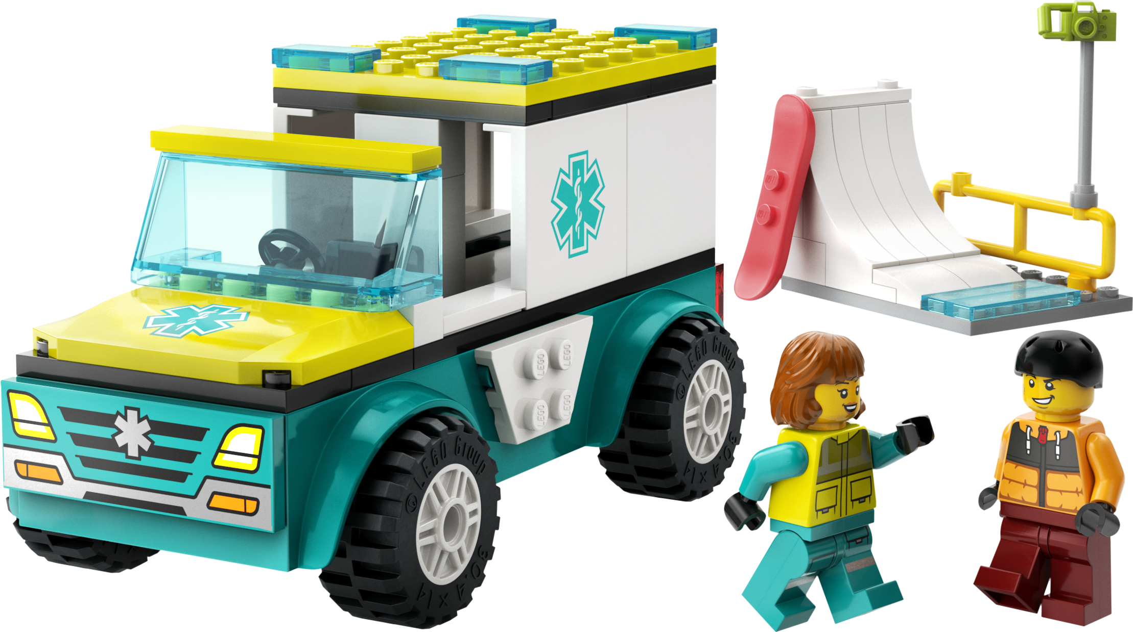 Oh je! Im LEGO® City Skatepark hat es geschneit und ein gestürzter Snowboarder braucht deine Hilfe. Lade die Krankentrage ein und lass den Rettungswagen losfahren. Der Schnee macht diesem Fahrzeug nichts aus, denn es hat Superhaftreifen, die auf den glatten Straßen nicht ins Rutschen kommen! Und an Bord ist genug Platz für den Patienten, seine Kamera, seinen Selfiestick und sein Snowboard. Deine Stadt, keine Limits! Los geht’s!