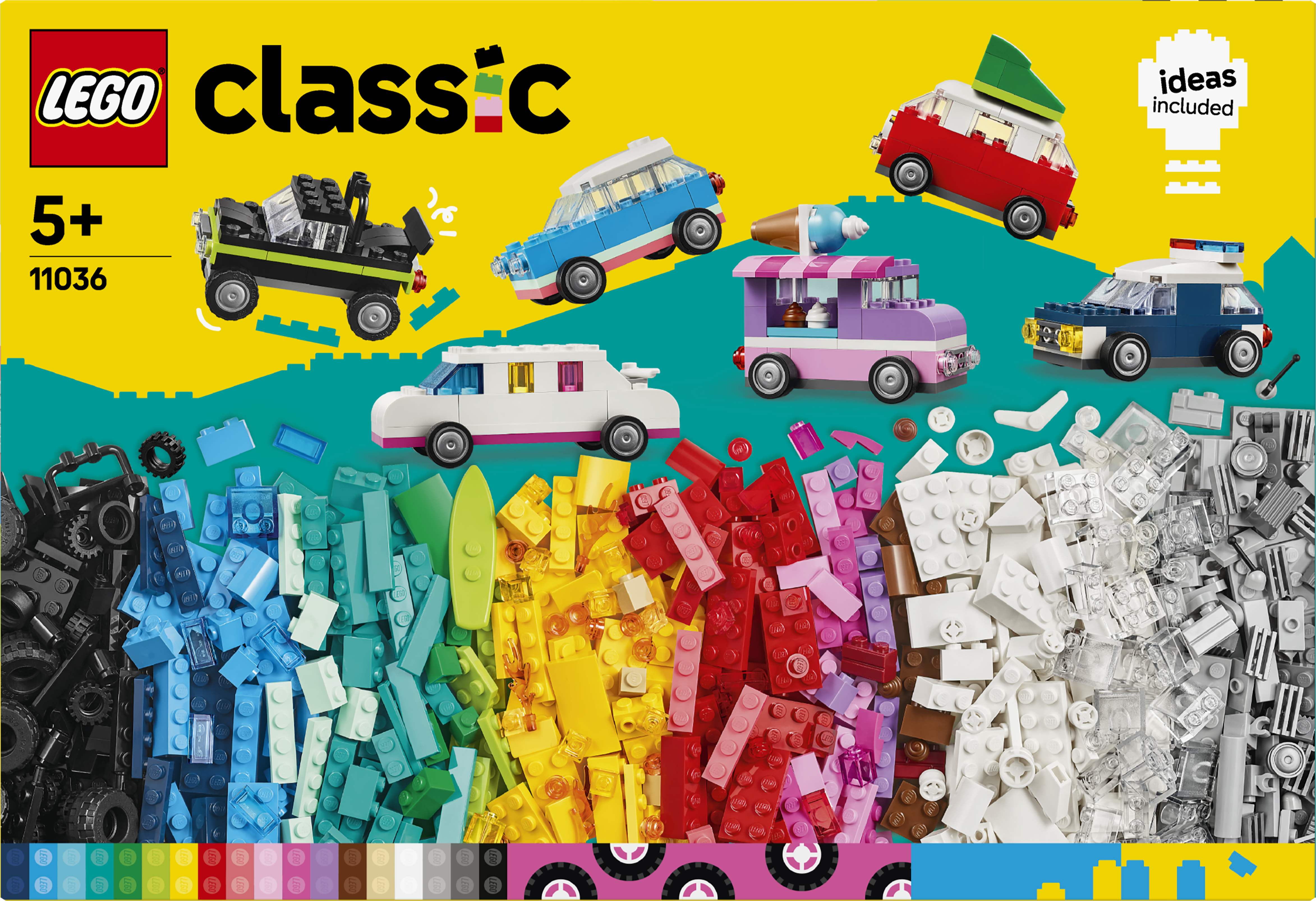 LEGO® Classic Kreative Fahrzeuge (11036) ist ein tolles Geschenk für junge Fahrzeugfans ab 5 Jahren. Dieses farbenfrohe Bau- und Spielset beinhaltet einen Mix aus Bausteinen und Teilen sowie einfache Bauanleitungen, um immer wieder neue Fahrzeuge erschaffen zu können. Aus 900 Bausteinen und speziellen Teilen wie den 52 Rädern kann dein Kind mithilfe der einfachen Anleitungen ein Polizeiauto, einen Eiswagen, ein Quad, einen Schaufellader, einen Lkw, einen Kombi, einen Geländewagen und eine Stretchlimousine bauen. Verschiedene Designideen, coole Details und bunte Verzierungen laden dann dazu ein, die Fahrzeuge vielseitig umzugestalten. Je mehr Kreativität und Baufähigkeiten die Kinder entwickeln, desto fantasievollere eigene Designs können sie ausprobieren. 10 fantasievolle Ideen inspirieren zum Bau ganz eigener Modelle. Die Bauanleitungen sind auch in der LEGO Builder App verfügbar, die Kinder digitale Modellansichten vergrößern und drehen sowie ihren Baufortschritt verfolgen lässt. LEGO Classic Spielsets liefern jede Menge Spielideen und Tipps und lassen Eltern wichtige Entwicklungsschritte ihrer Kinder miterleben.