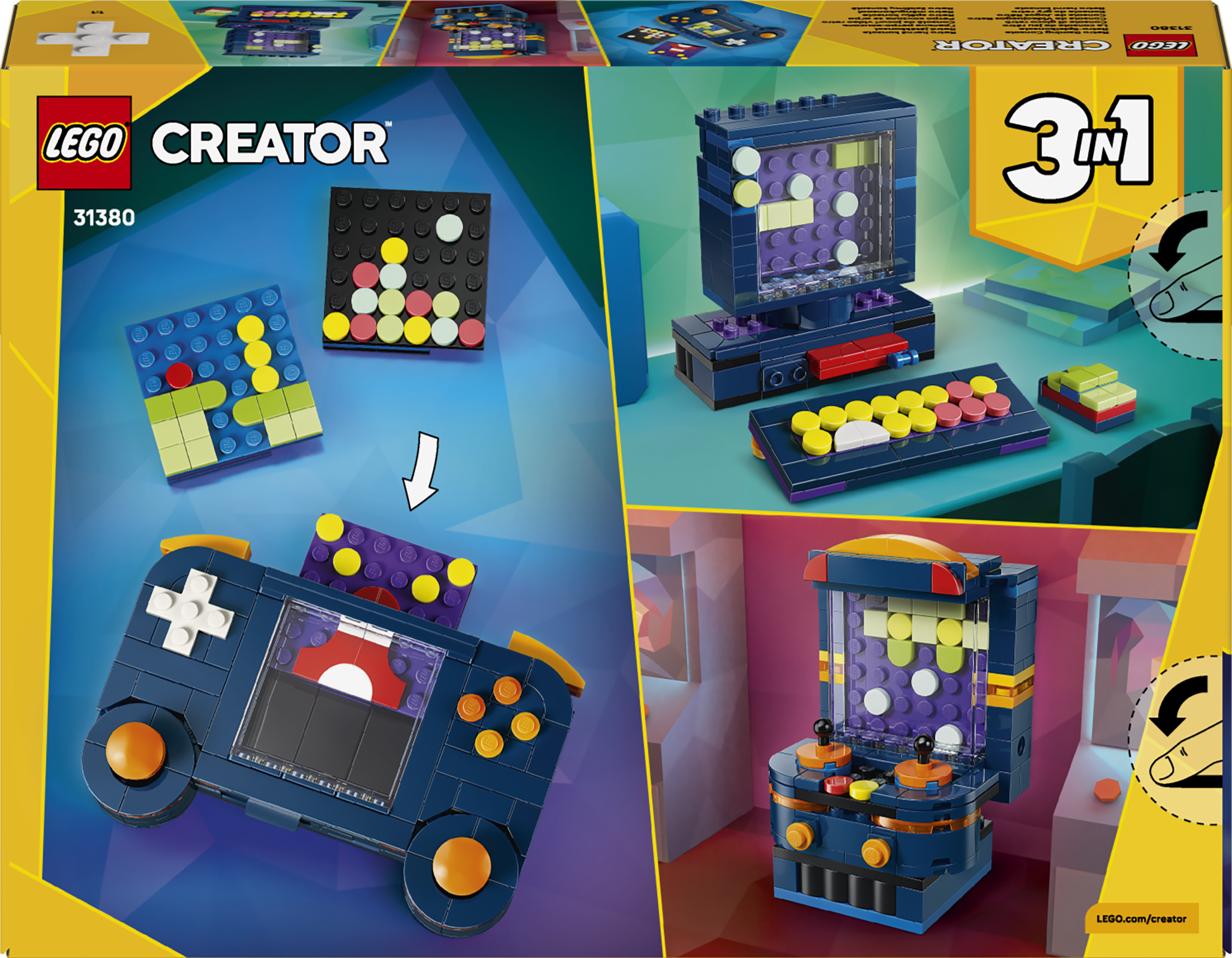 Jungen und Mädchen können zunächst eine tragbare LEGO Bauset Spielkonsole mit beweglichen Joysticks und Knöpfen bauen und drei verschiedene Spielmodule hineinstecken. Danach lässt sich das Modell entweder in einen Mini-PC mit Bildschirm, Tastatur und Diskette oder in einen klassischen Spielautomaten mit Bedienfeld und Monitor umbauen. Die authentischen Details und nostalgischen Elemente machen das Set auch für Erwachsene zu einem Hingucker im Regal.