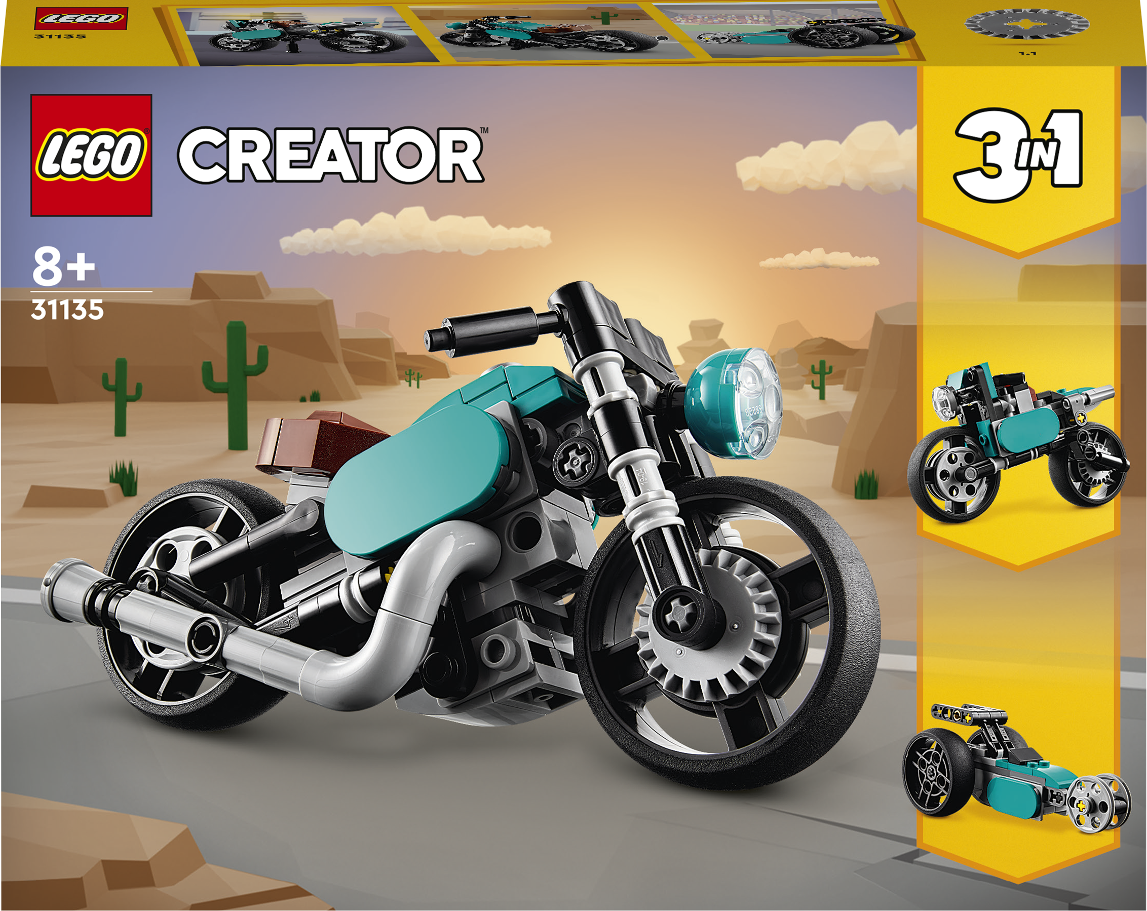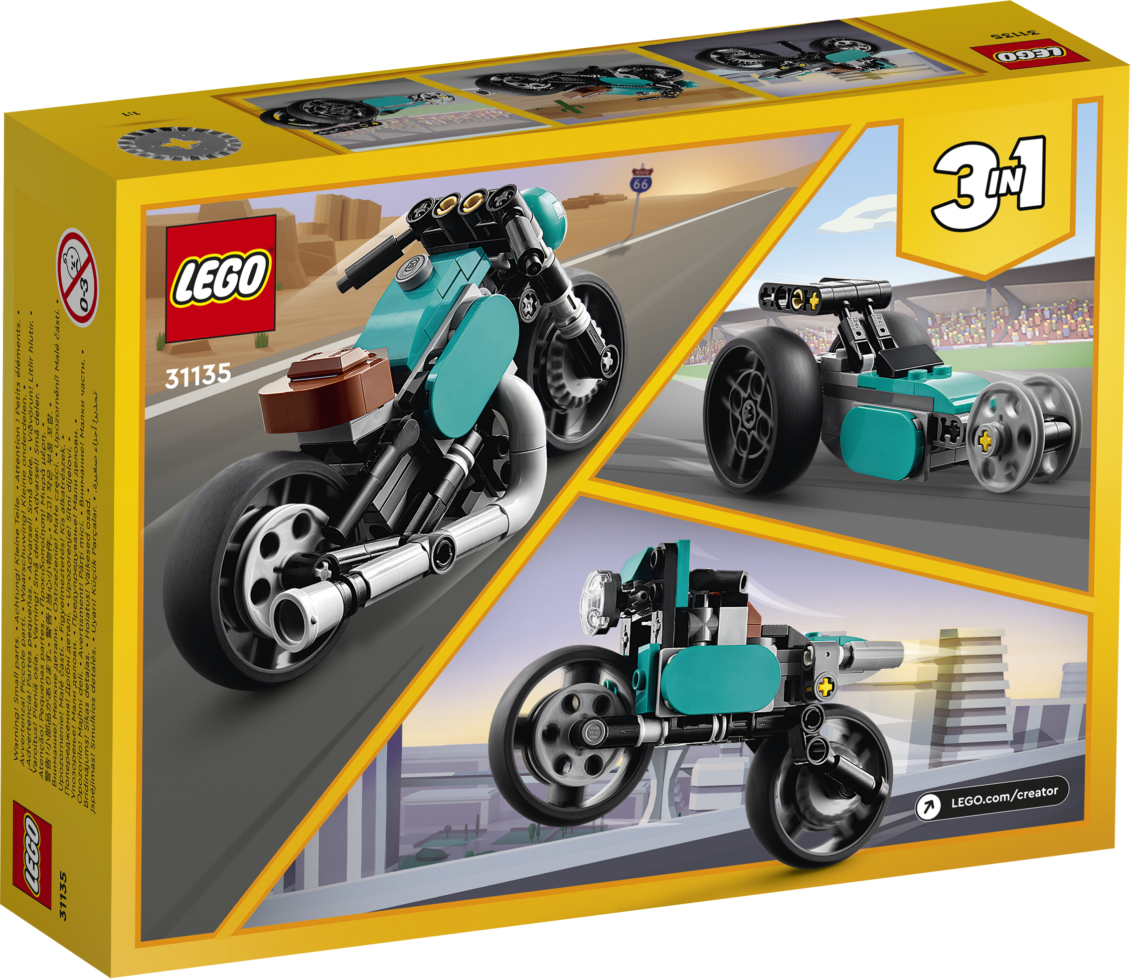 • 3-in-1-Spielzeug: Kinder ab 8 Jahren können mit dem LEGO® Creator Oldtimer Motorrad (31135) besonders fantasievoll spielen. Das 3-in-1-Spielset beinhaltet ein Motorrad, eine Straßenmaschine und einen Top Fuel Dragster