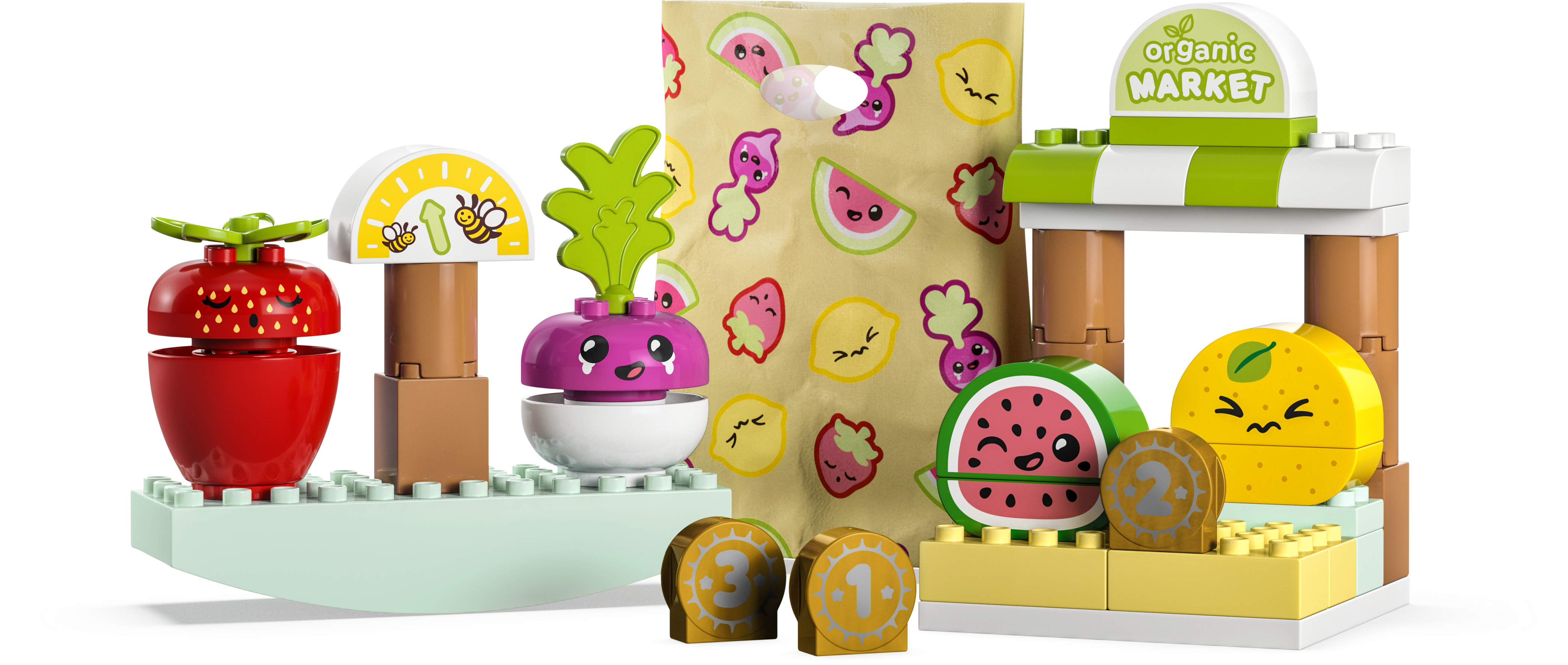 Der LEGO® DUPLO® Biomarkt (10983) ist ein toller erster „Kaufmannsladen“. Das bezaubernde Spielset lässt dein Kleinkind echte Bauernmärkte nachstellen und Waren abwiegen, mit unterschiedlichen Münzen zahlen und die Einkäufe dann in der Stofftasche mitnehmen. Lernspielzeug, bei dem der Spaß im Vordergrund steht Wenn dein Kind das Radieschen, die Erdbeere, die Zitrone und die Wassermelone stapelt, lernt es das Balancieren. Alle LEGO DUPLO Sets fördern Kleinkinder in ihrer Kreativität. Jedes Stück Obst und Gemüse in diesem Set hat einen anderen Gerichtsausdruck, um dein Kind kreativ spielen zu lassen! Entwicklungsförderndes Spielzeug für Kleinkinder LEGO DUPLO Spielzeuge lassen Vorschulkinder kreativ spielen und ganz spielerisch lernen. Dieses Set lädt Kleinkinder und Erwachsene zum interaktiven Spielen ein und lässt sie in die Rolle des Budenbesitzers schlüpfen, der Obst und Gemüse verkauft. Beim gemeinsamen Bauen und Spielen mit den DUPLO Spielsets können Eltern wichtige Entwicklungsschritte ihrer jungen Kinder miterleben.
