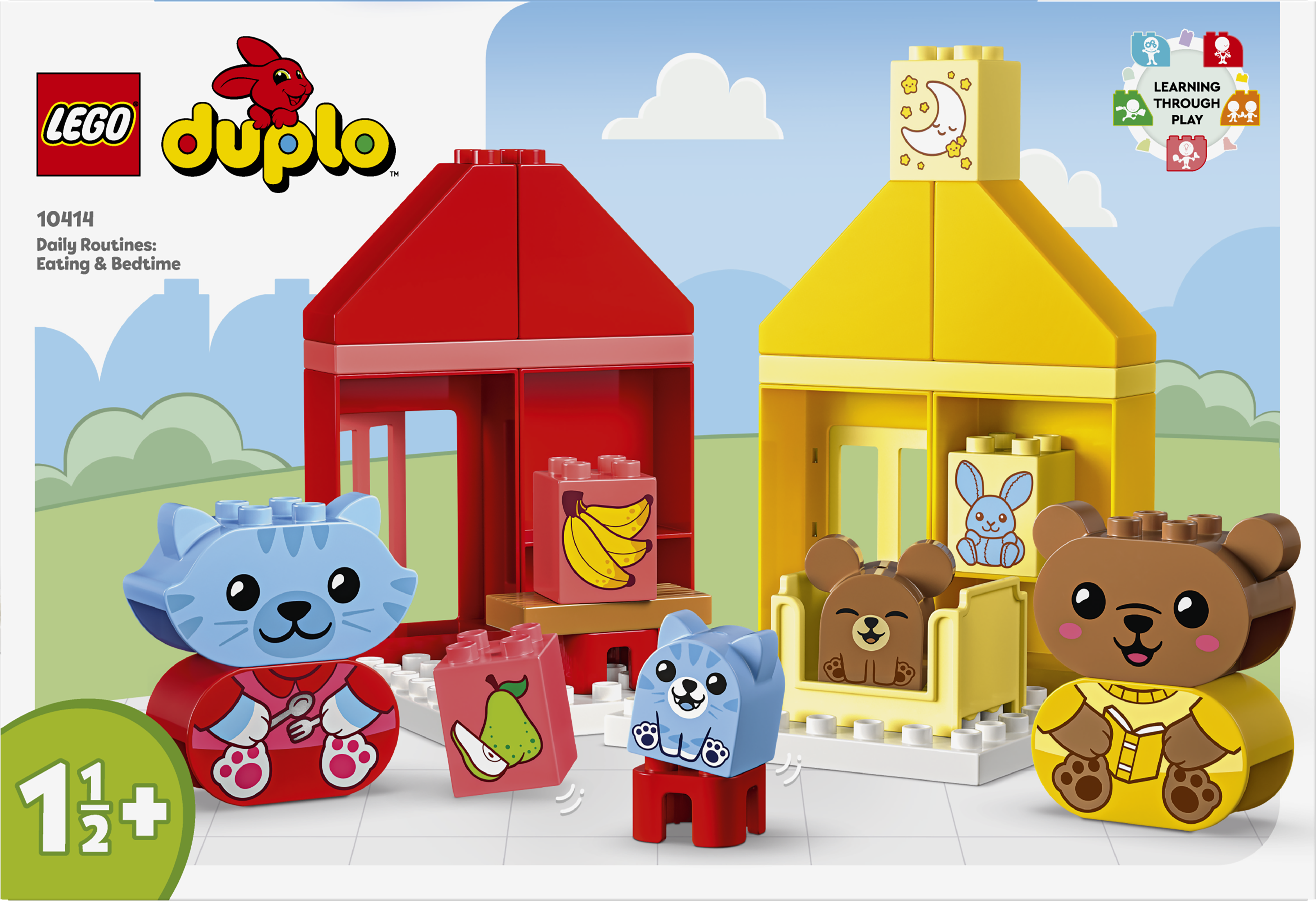 LEGO® DUPLO® Alltagsroutinen: Essen & Schlafenszeit (10414) ist ein Spielzeug, das Kleinkinder die eigenen Gefühle erkunden lässt. Dieses lustige Spielset für Vorschulkinder ab 18 Monaten beinhaltet 4 sympathische Tierfiguren. Das Schlafengehen und gemeinsame Mahlzeiten können für kleine Kinder sehr emotional sein. Dieses Lernspielzeug lässt Kleinkinder ausdrücken, wie sie sich bei diesen Aktivitäten fühlen. Das Set beinhaltet 2 niedliche Tierfamilien aus jeweils einem erwachsenen Tier und einem Tierbaby. Für das Katzenbaby und das Bärenbaby sind Gesichtssteine mit mürrischer und fröhlicher Seite enthalten, damit auch Kleinkinder, die noch nicht sprechen können, zeigen können, wie sie sich fühlen. LEGO DUPLO Sets eignen sich besonders gut für spielerisches Lernen. Bei unterhaltsamen interaktiven Rollenspielen können die Eltern die Spielzeugfiguren benutzen, um Kleinkindern zu erklären, wie wichtig Alltagsroutinen sind. Kleinkinder entwickeln Fingerfertigkeit, wenn sie die bunten Steine zu 2 Spielzeughäusern zusammenstecken. Beide Alltagsroutinen sind mit farblich übereinstimmenden Steinen dargestellt, damit das Bauen ein Kinderspiel ist.