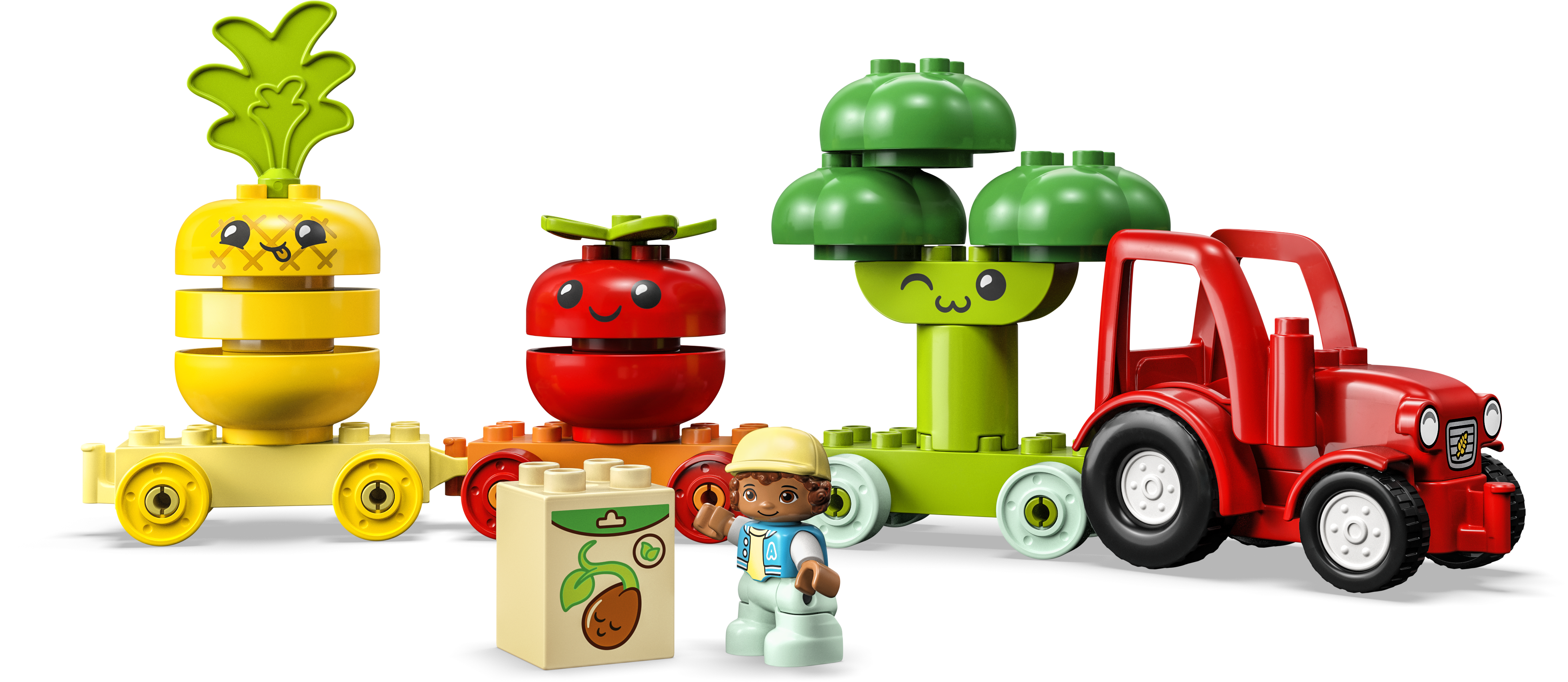 Der LEGO® DUPLO® Obst- und Gemüse-Traktor (10982) lässt Kleinkinder auf vielfältige Weise lernen. Vorschulkinder können den Landwirt auf seinem Traktor mit 3 Anhängern zur Obst- und Gemüseernte begleiten. Kinder ab 18 Monaten können mit dem Set das Stapeln üben, größere Fingerfertigkeit entwickeln und etwas darüber erfahren, wie Obst und Gemüse gedeihen. Indem sie die Bausteine stapeln, lassen sie die Pflanzen wachsen. Bunte Steine bieten jede Menge Sortierspaß. Vorschulkinder können jede Pflanze auf den farblich passenden Anhänger laden, die Farben kreativ mischen und neu kombinieren und sogar die Gesichter austauschen! Entwicklungsfördernde Spielzeuge für riesigen Lernspaß Alle LEGO DUPLO Spielzeuge werden fachkundig konzipiert, um Kleinkinder mit bunten Bausteinen, faszinierenden Figuren und vielen Details fantasievoll spielen, interessante Geschichten darstellen und erste Fähigkeiten entwickeln zu lassen. Außerdem kann man dieses Spielzeug auch mit den anderen Biobauernhof-Spielsets sowie allen anderen LEGO DUPLO Modellen kombinieren.
