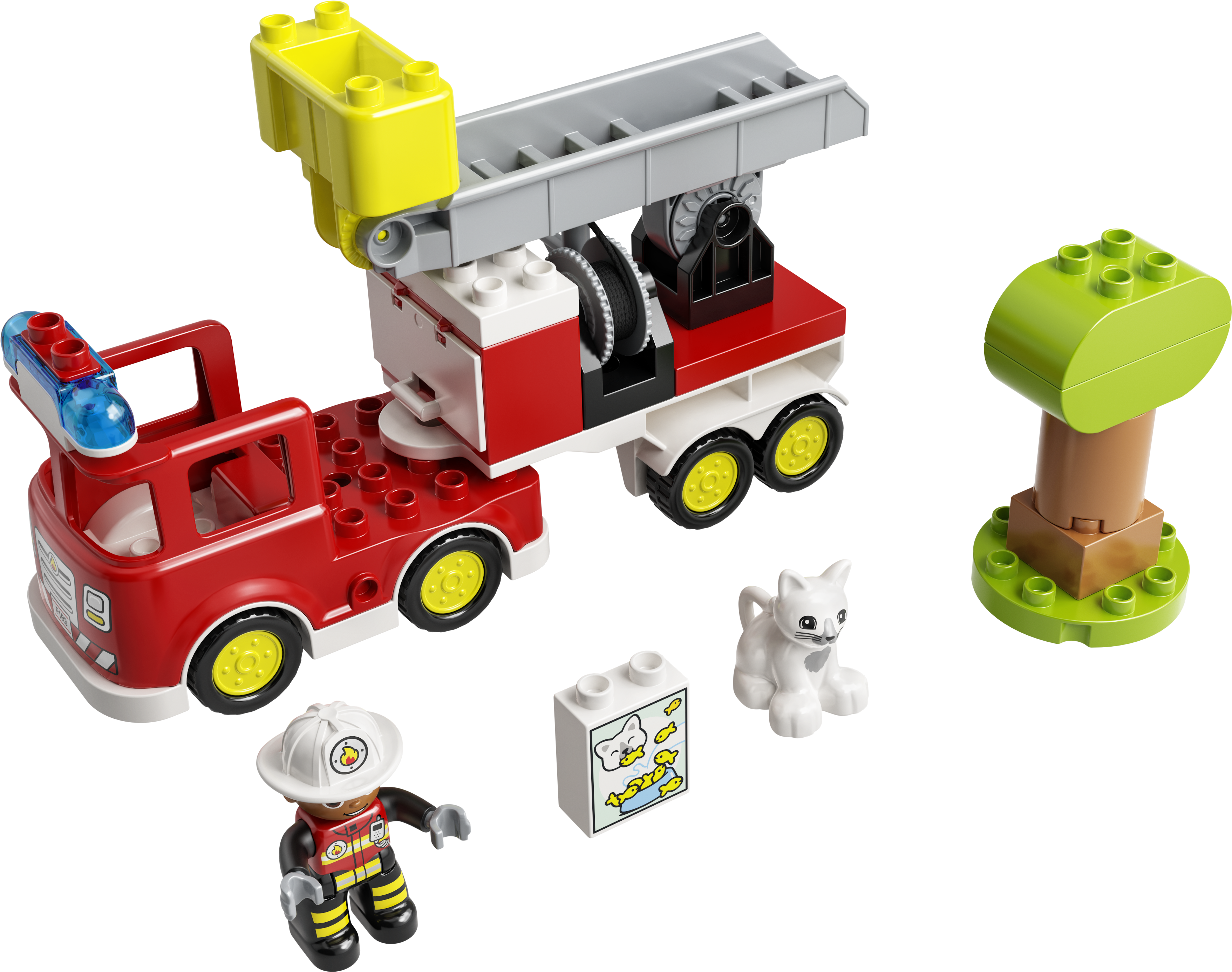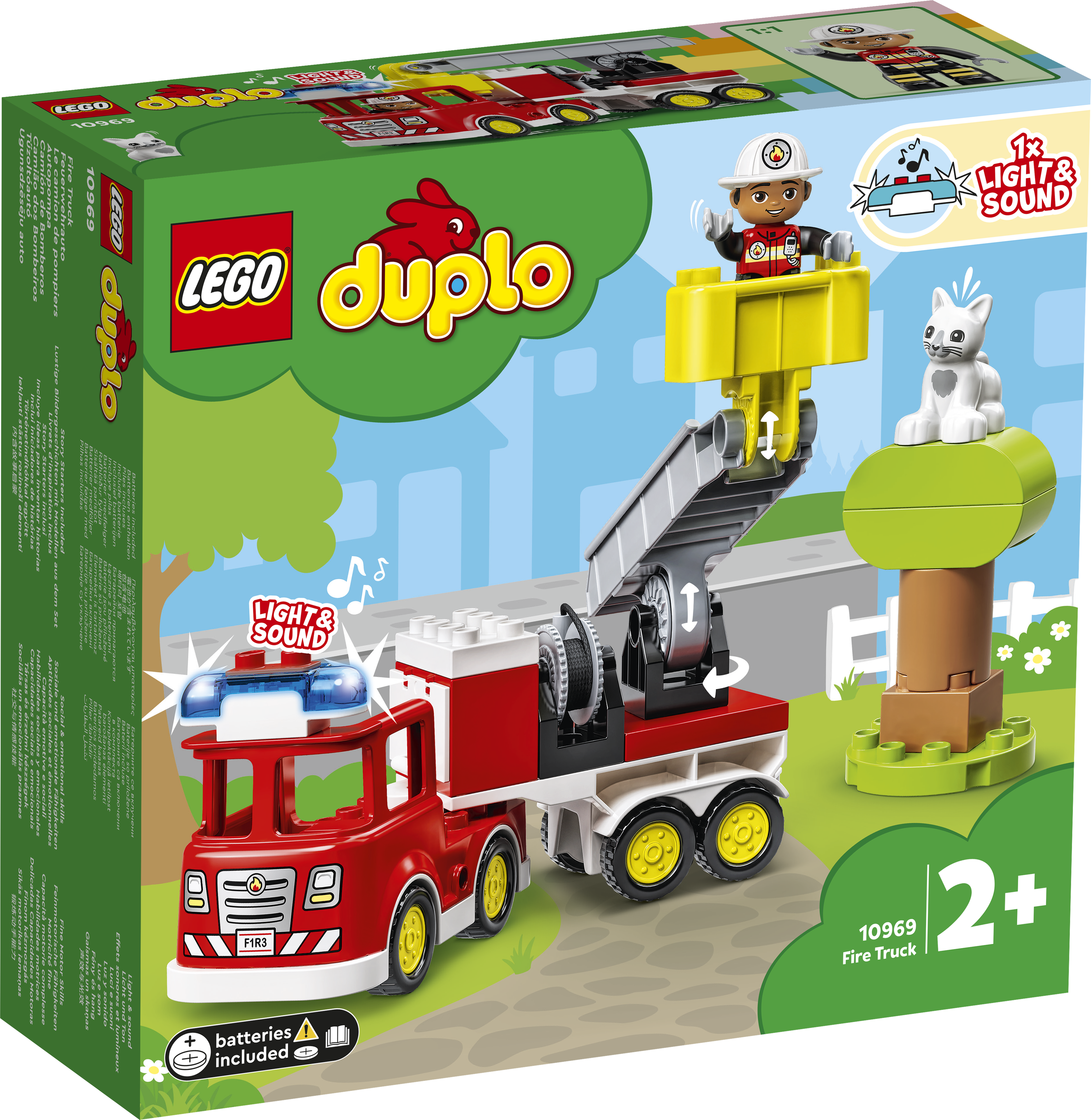 Das LEGO® DUPLO® Feuerwehrauto (10969) fasziniert Kinder ab 2 Jahren, die sich für Löschautos interessieren. Tierrettungen mit dem Feuerwehrauto Eine Katze sitzt hoch oben auf dem Baum und traut sich nicht mehr herunter! Mit blinkendem Blaulicht und schrillendem Martinshorn (Batterien liegen bei) kommt das Feuerwehrauto zu Hilfe. Dein Kind kann die Kurbel drehen, um die Leiter hochzufahren, und die Leiter dann mit dem Korb schwenken. Sollte das arme Kätzchen sich nicht von der Stelle rühren, lässt es sich vielleicht mit Leckerli runterlocken. Als letztes Mittel bleibt dann nur noch der Löschschlauch! Dieses Spielset lässt Vorschulkinder soziale, emotionale und feinmotorische Fähigkeiten entwickeln, wenn sie in die Rolle des freundlichen Feuerwehrmanns schlüpfen und das Feuerwehrauto mit den tollen Funktionen benutzen, um das niedliche Kätzchen vom Baum retten. Spielerischer Lernspaß für Kleinkinder Wenn junge Kinder mit den LEGO DUPLO Spielzeugen kreativ spielen und die Welt erkunden, können Eltern wichtige Entwicklungsschritte miterleben.