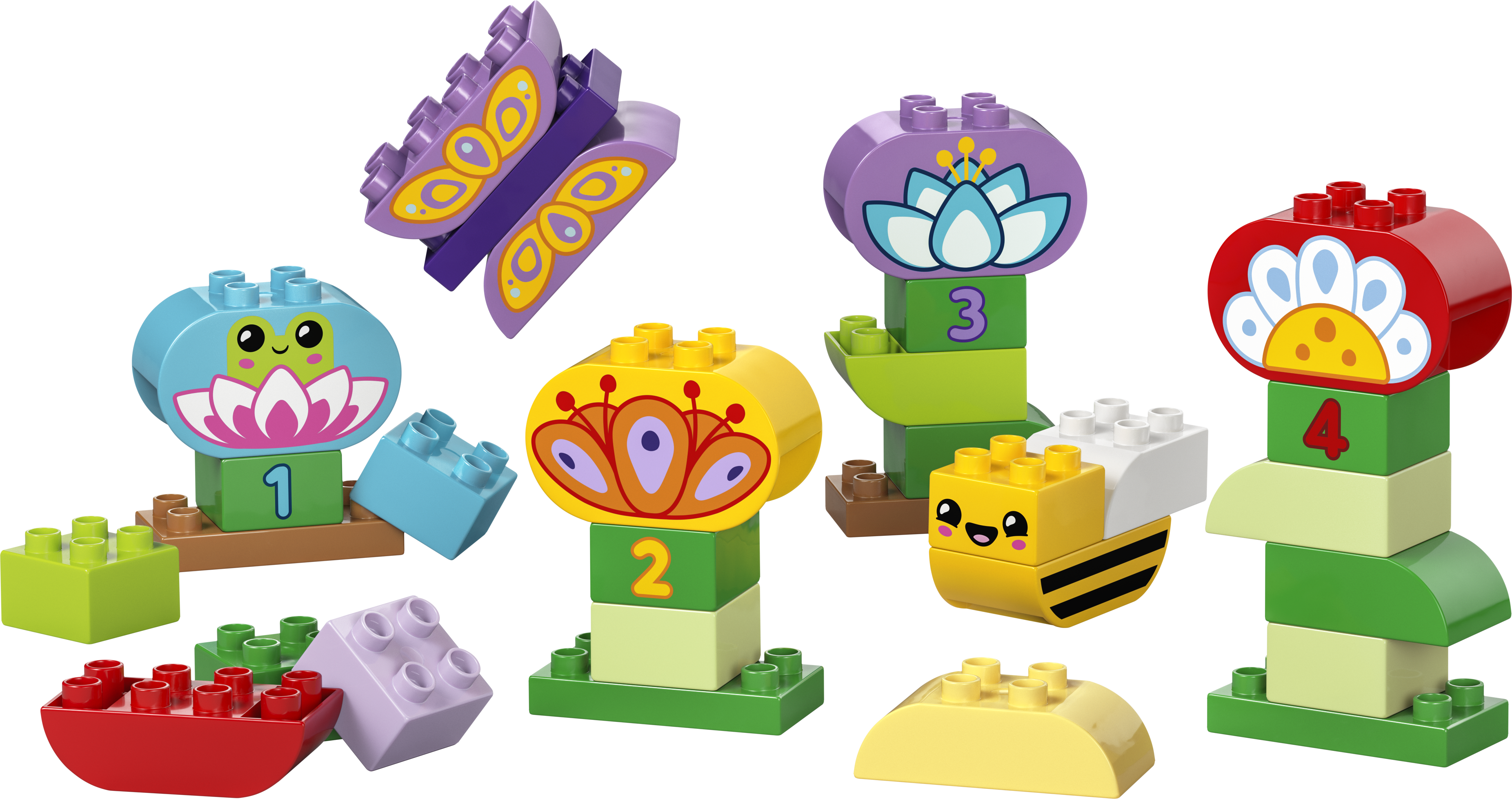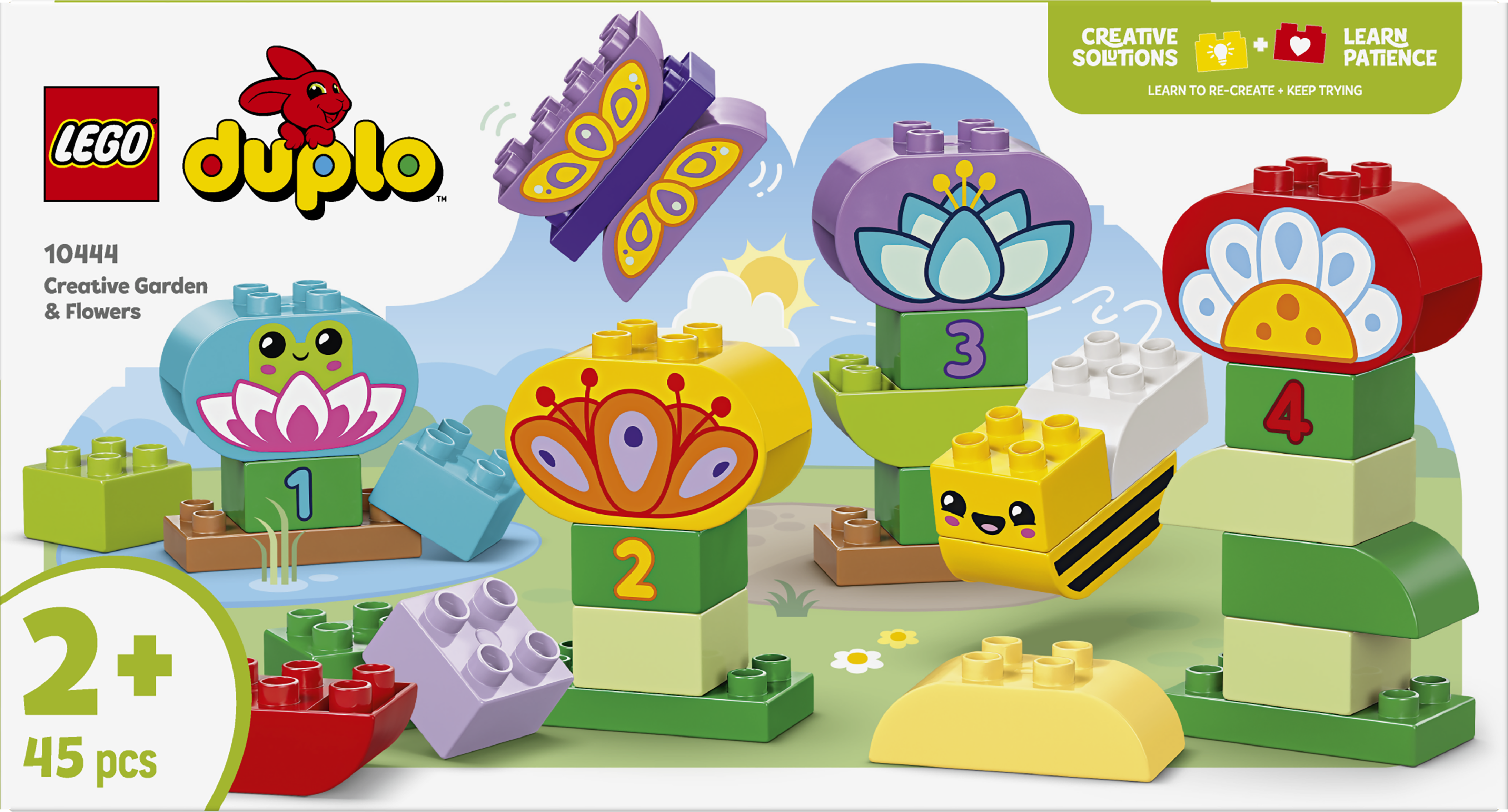 LEGO® DUPLO® Town Kreativer Blumengarten (10444) ist ein Stapelspielzeug, mit dem dein Kind kreativ spielen und größere Fingerfertigkeit entwickeln kann. 45 Bausteine laden kreative Kinder dazu, eine schöne Gartenkulisse mit bunten Blumen und niedlichen LEGO DUPLO Tieren zu erschaffen und immer wieder umzugestalten. Dieses Lernspielzeug weckt die Fantasie von Vorschulkindern, denn es lässt sie die Welt nachbilden, die sie jeden Tag sehen. Wenn Kinder ihren Spielzeuggarten mit den 45 Bausteinen aus diesem Set bauen, lernen sie, Zahlen zu erkennen, Farben zu unterscheiden und zu sortieren und besser zu sprechen. Und wenn sie die verschiedenen Bausteine zu Tieren oder Blumen zusammenstecken, entwickeln sie Fingerfertigkeit und Ausdauer. Du suchst nach dem besten Geschenk für ein Vorschulkind? Diesem kreativen Spielset liegen jede Menge Bausteine bei, um Kleinkindern die kreative Freiheit zu geben, den Garten so zu bauen, wie es ihnen gefällt, und den Schmetterling, die Biene und den Frosch dorthin zu setzen, wo es ihnen passt. Dabei erlernen sie ganz spielerisch neue Fähigkeiten.