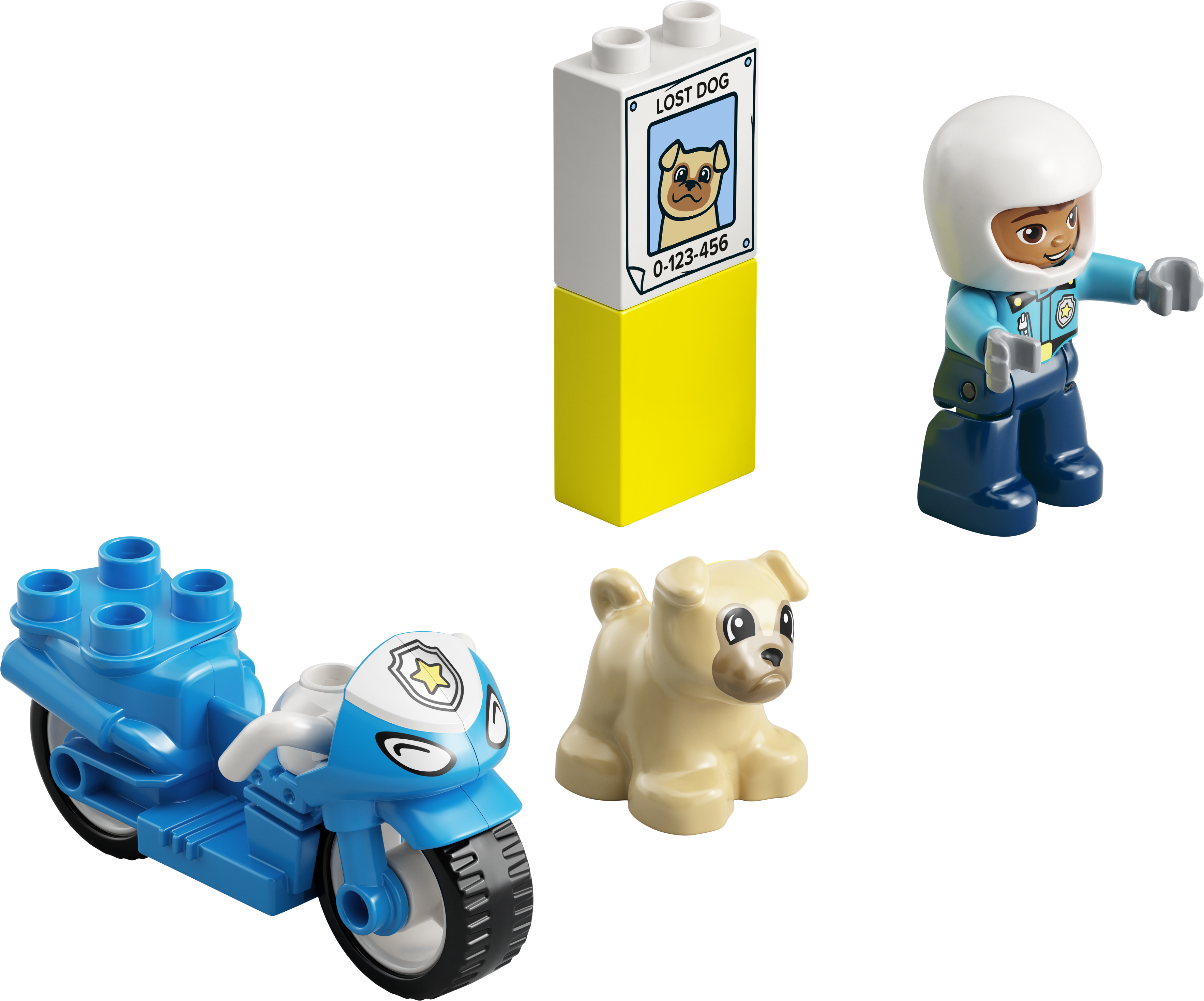 • Fantasievolles Spielvergnügen: Das Set beinhaltet 2 LEGO® DUPLO® Figuren – einen Polizisten und einen niedlichen Hund – ein Plakat mit der Aufschrift „Lost Dog“ sowie ein cooles blaues Polizeimotorrad, auf das der Polizist und der Hund passen