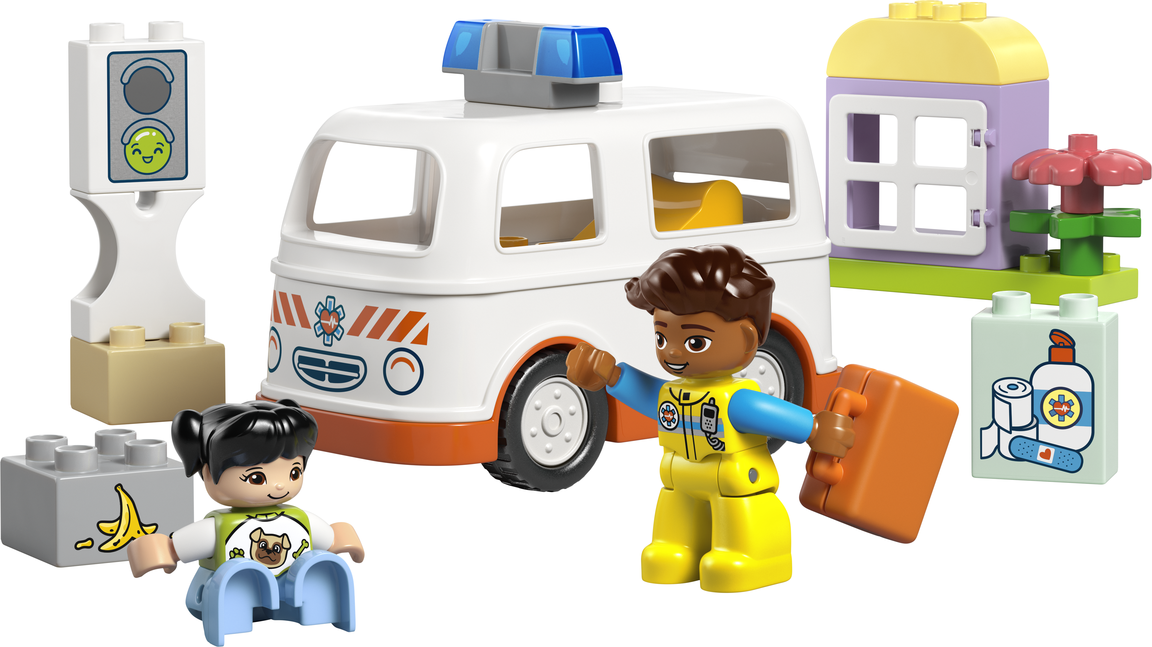 Rettungswagen mit Fahrer (10447) ist ein Spielzeug, mit dem Kleinkinder spannende Rettungseinsätze darstellen können. Das Set beinhaltet einen fahrbaren Spielzeugrettungswagen und 2 LEGO® DUPLO® Figuren. Ein Rettungssanitäter und ein Mädchen ladenzu kreativen Rollenspielen ein. Dieses LEGO DUPLO Spielzeug ist ein tolles Geschenk für Kleinkinder, die Aktivitäten lieben, die ihre soziale und emotionale Entwicklung fördern. Das Set bringt Vorschulkindern Empathie bei. Die Bauanleitung enthält auch ein bedrucktes „Glücksrad“, mit dem Eltern und Vorschulkinder die unterschiedlichen Gefühle des Mädchens durchspielen können. Kleinkinder können mit diesem Rad auch zeigen, wie sie sich fühlen, wenn sie krank sind, oder was sie empfunden haben, als sie zum ersten Mal einen Rettungswagen gesehen haben. Wenn sie das Dach des Rettungswagens abheben, um das Mädchen auf die Liege zu setzen, entwickeln Kinder logisches Denkvermögen und Fingerfertigkeit. Dieses Lernspielzeug vermittelt Vorschulkindern zudem soziale Fähigkeiten, wenn sie erkunden, wie der Rettungswagenfahrer die Patientin behandeln würde.