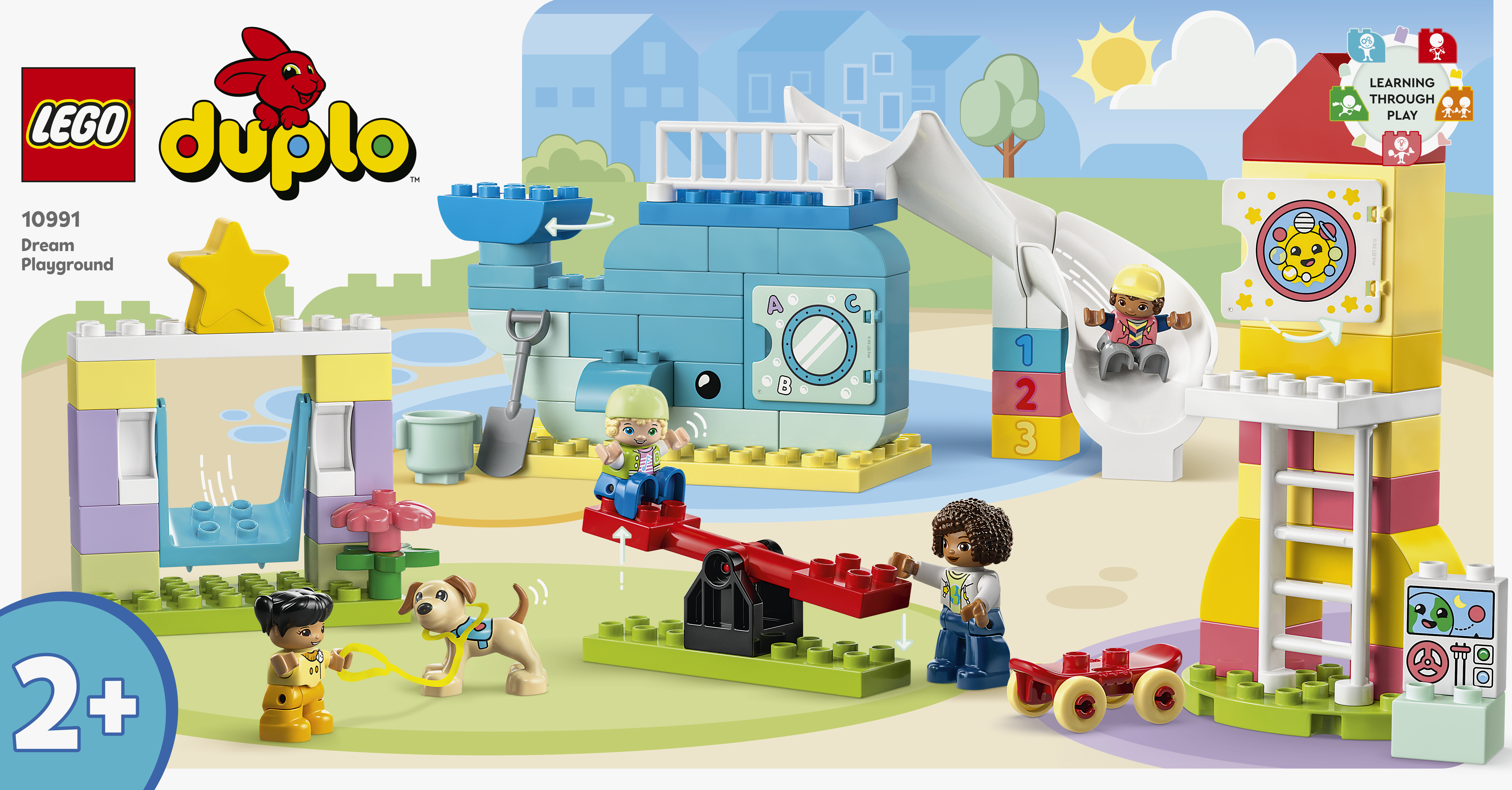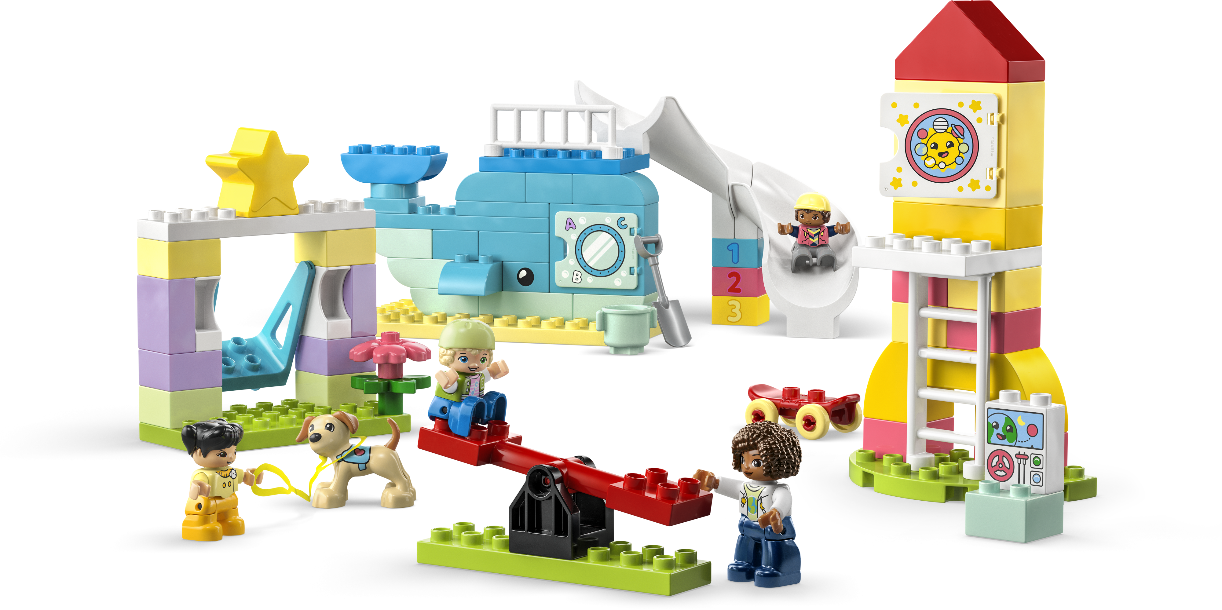 Hol dir mit dem LEGO® DUPLO® Town Traumspielplatz (10991) ein vielseitiges Spielerlebnis ins Kinderzimmer. Kleinkinder ab 2 Jahren können einen faszinierenden Spielplatz bauen und dabei lernen, spielen und neue Freundschaften schließen. Spielspaß mit einem Spielzeug für Kleinkinder Dieser entwicklungsfördernde Spielplatz ist ein kreatives Geburtsgeschenk und besteht aus zahlreichen modernen Spielgeräten. Wenn Kleinkinder das Wal-Klettergerüst erklimmen, lernen sie einige Buchstaben und Zahlen. Außerdem können sie sich mit den unterschiedlichen Figuren anfreunden, beispielsweise mit dem Skater und dem niedlichen Blindenhund! Beim Spielen mit diesen Figuren erwerben Kleinkinder soziale Fähigkeiten, die ihnen dann auch im Alltag nützlich sein können. Spielerisches Lernen LEGO Town Bausets lassen Kinder ihre Umwelt erkunden und das moderne Leben bei Rollenspielen nachstellen. Wie alle LEGO DUPLO Spielzeuge bietet auch dieses Set die unterschiedlichsten Lernmöglichkeiten. Die knallbunten Steine sind leicht zu greifen, und die faszinierenden beweglichen Teile regen die Sinne der Kinder an und lassen sie eine bessere Fingerfertigkeit entwickeln.