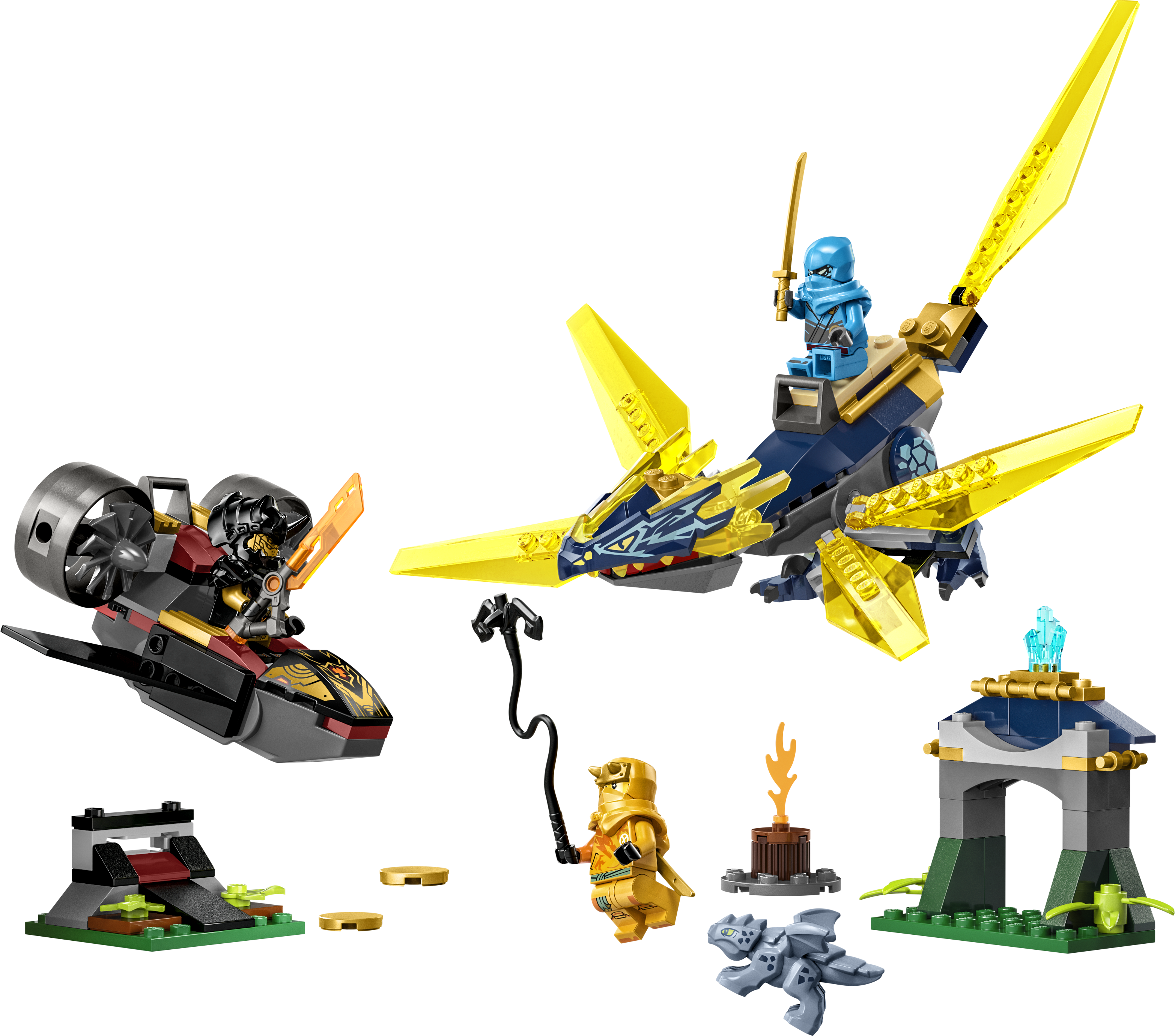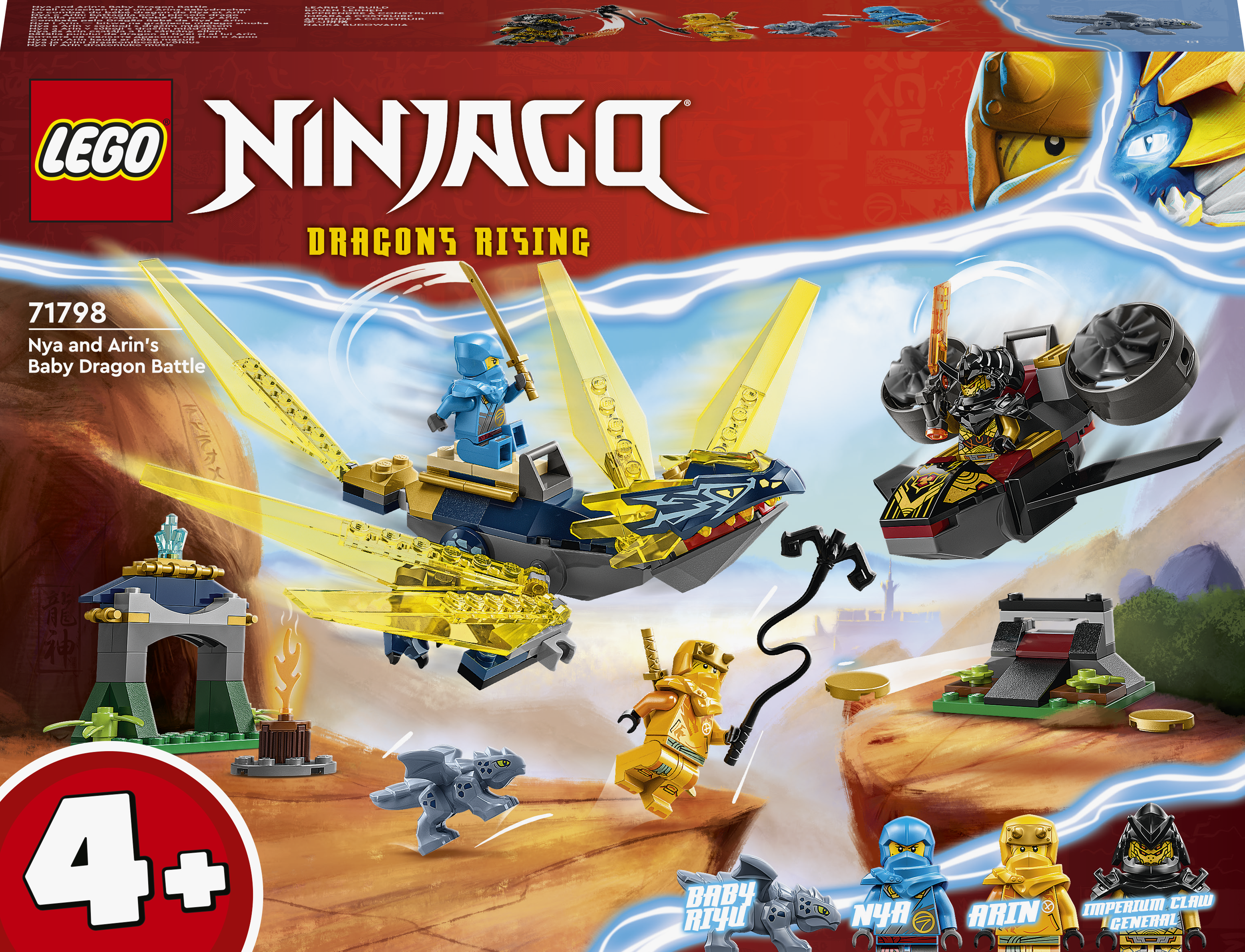 Duell zwischen Nya und Arins Babydrachen (71798) ist genau das richtige Spielset, um Kindern ab 4 Jahren das Bauen beizubringen und sie spannende Szenen aus der TV-Serie NINJAGO: Aufstieg der Drachen nachstellen zu lassen. Dieses faszinierende Bauset beinhaltet 2 Drachen, einen Düsenjet, ein Höhlenversteck mit Energiekristallen sowie 3 Minifiguren, die zu vielen packenden Rollenspielen einladen. LEGO® Anfänger-Set, das Kindern das Bauen beibringt Dieses LEGO NINJAGO Spielset wurde eigens entwickelt, um Kindern ab 4 Jahren ein fantastisches Bau- und Spielerlebnis zu vermitteln. Jeder Beutel in der Box enthält die LEGO Steine für ein Modell und eine Figur, damit die Kinder rasch spielen können. Ein teilweise zusammengesetztes Starter-Bauelement erleichtert das Bauen ganz erheblich. Cooles digitales Bauerlebnis für kleine LEGO Baumeister Die LEGO Builder App begleitet dich und dein Kind auf ein leichtes und intuitives Bauabenteuer. Vergrößere und drehe 3D-Ansichten der Modelle, speichere Sets und verfolge deinen Baufortschritt.