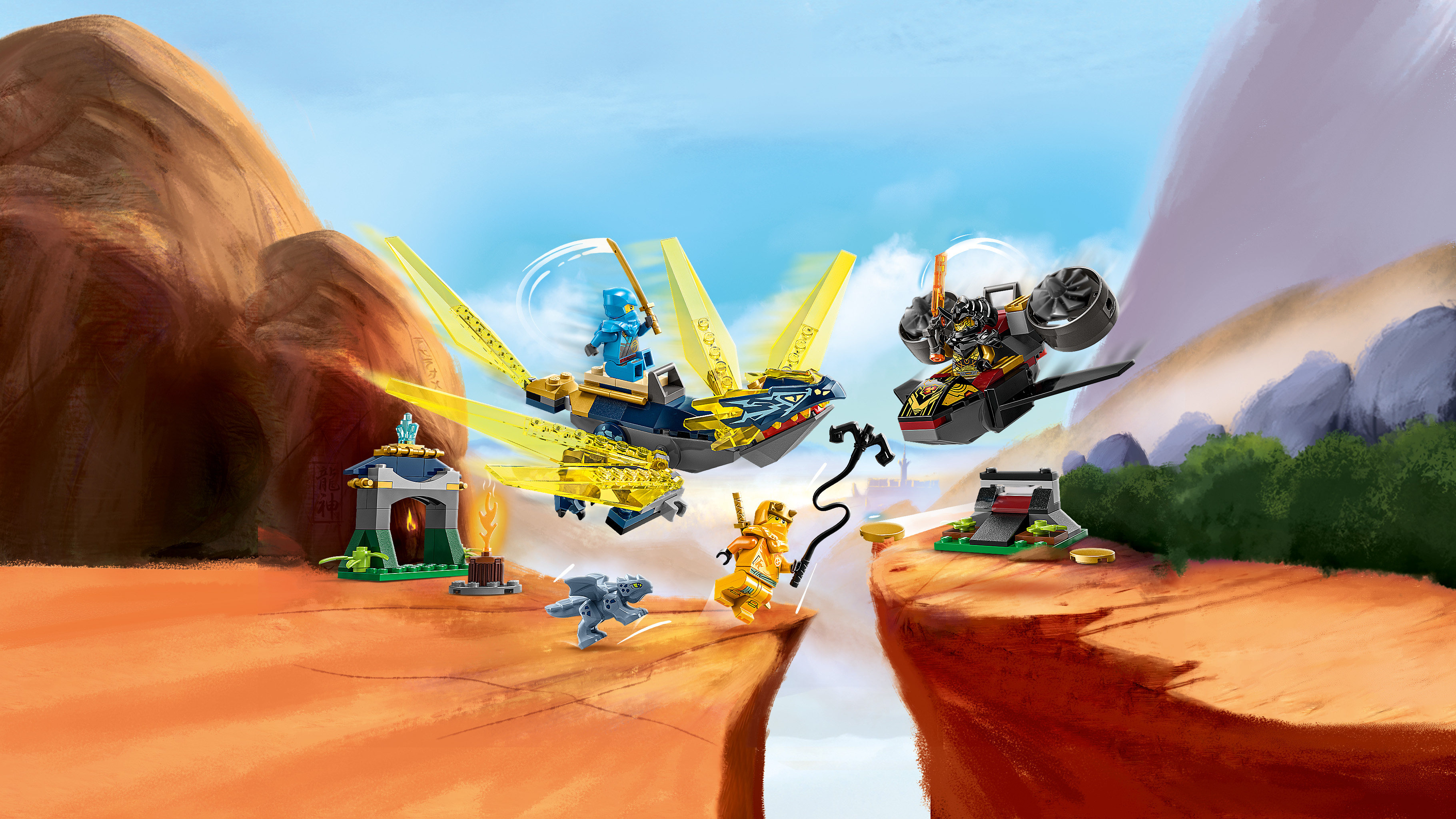 Kinder ab 4 Jahren können die Actionszenen aus der TV-Serie NINJAGO: Aufstieg der Drachen mit dem Düsenjet, den beiden Drachen und den 3 Minifiguren aus diesem Spielset nachstellen