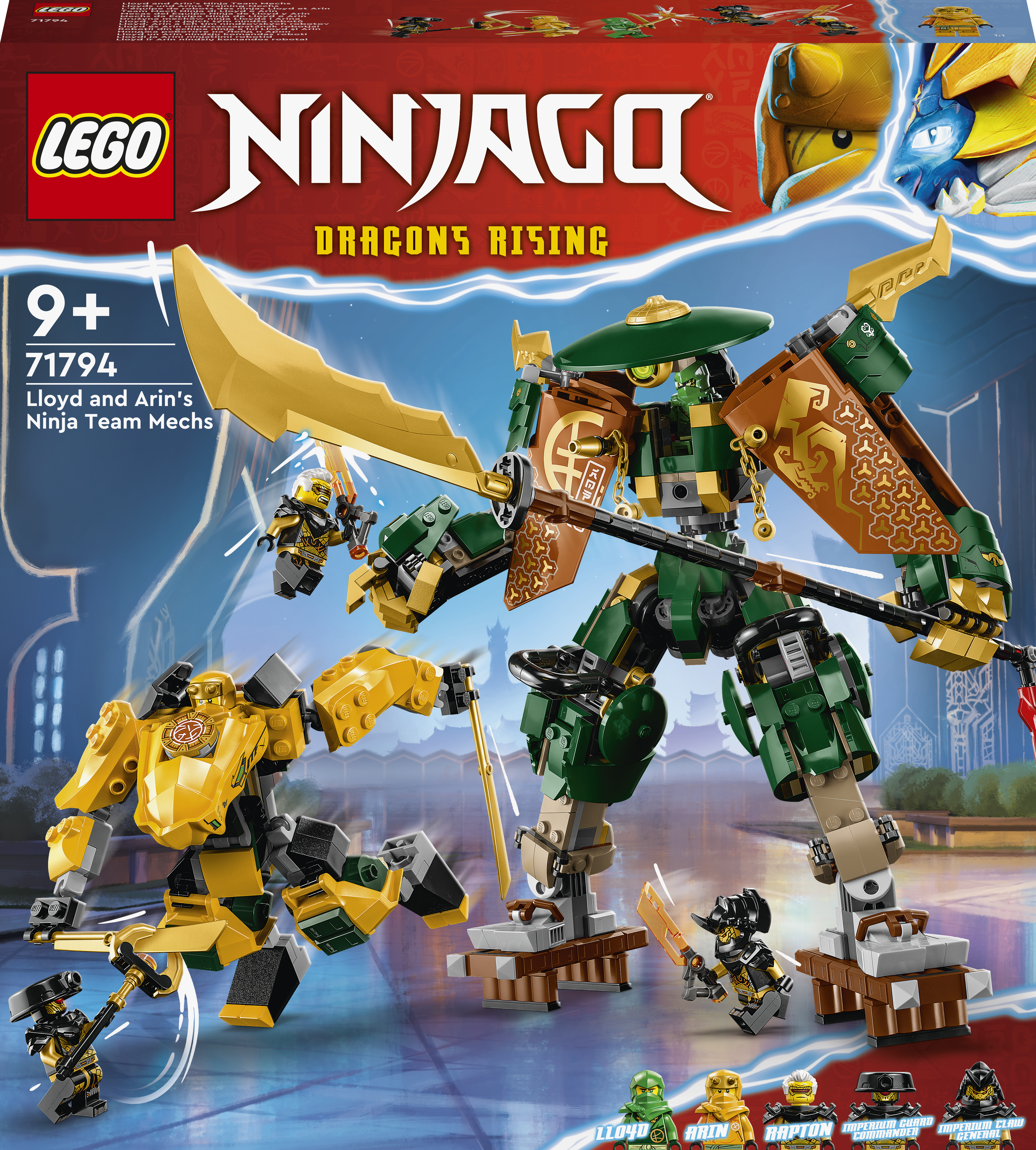 Mit Lloyds und Arins Training-Mechs (71794) können Kinder ab 9 Jahren tolle Trainingseinheiten und packende Actionszenen aus der TV-Serie NINJAGO: Aufstieg der Drachen nachstellen. Dieses beispiellose Bauset beinhaltet die beweglichen Mechs von Ninja-Meister Lloyd und seinem Schüler Arin, die sich für unzählige weitere Spielmöglichkeiten zu einem größeren und noch besser ausgerüsteten Mech vereinen lassen. 5 Minifiguren für spannende Duelle Dieses Mech-Spielset beinhaltet 5 Minifiguren. Der Ninja-Meister Lloyd trägt 2 Katanas, sein Ninja-Schüler Arin hat neben 2 Katanas auch noch einen Enterhaken. Gemeinsam müssen sie es mit 3 Bösewichten aufnehmen, das heißt mit Rapton, der ein kaiserliches Schwert schwingt, mit dem Kaiserlichen Wachkommandanten, der einen Stab hat, sowie mit dem Kaiserlichen Klauengeneral, der ebenfalls ein kaiserliches Schwert trägt. In diesem Set ist alles vorhanden, was Kinder für unzählige Rollenspiele und packende Duelle brauchen. LEGO® Builder App Die LEGO Builder App begleitet dich und dein Kind auf ein leichtes und intuitives Bauabenteuer. Vergrößere und drehe 3D-Ansichten der Modelle, speichere Sets und verfolge deinen Baufortschritt.