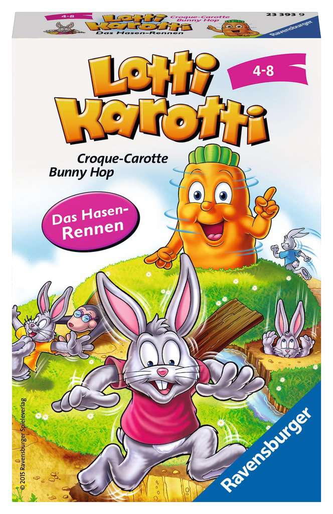 Beim spannenden Wettrennen bestimmt das Glücksrad, wohin die Hasen hüpfen: auf ein sicheres Feld oder - hoppla - in ein gefährliches Loch? Wer kommt als Erster bei der Karotte an?