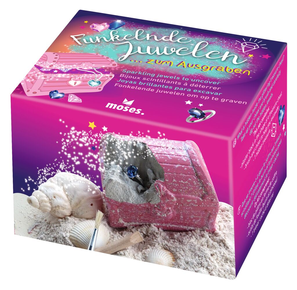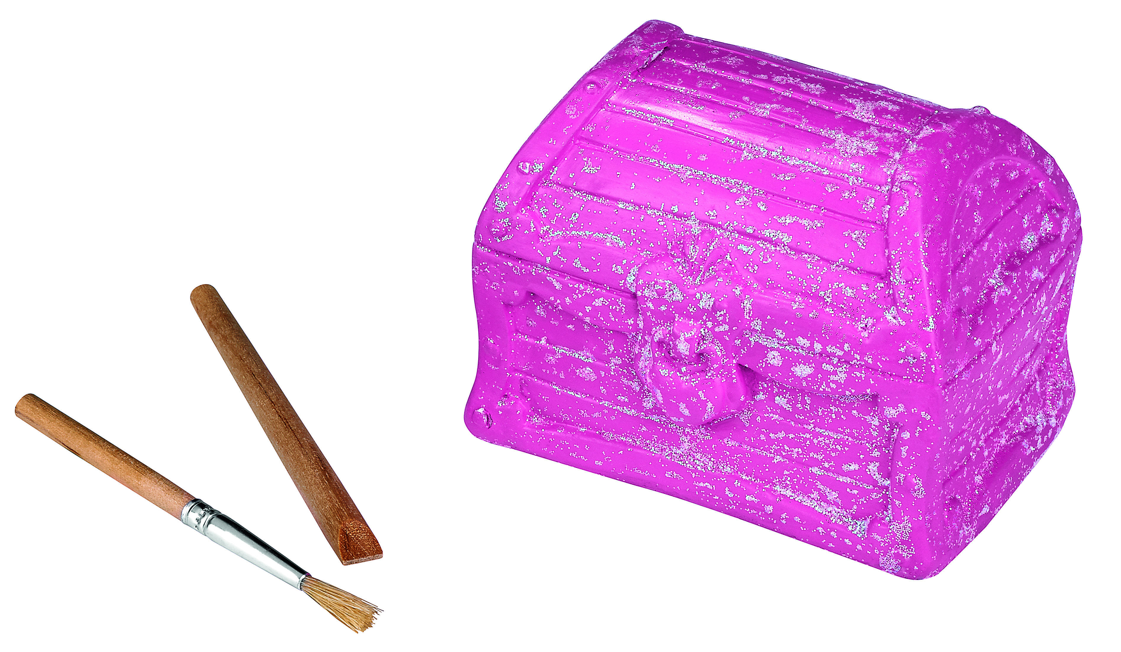 Wer wollte nicht schon immer einen funkelnden Schatz ausgraben? Aus der glitzernden Schatztruhe aus rosafarbenem Gips kann man selbst mit Meißel und Pinsel entweder einen verstellbaren Fingerring mit Schmuckstein oder einen funkelnden Kettenanhänger ausgraben. Der schöne Schmuck enthält einen rosafarbenen, blauen oder türkisfarbenen Schmuckstein. Was genau für ein Schmuckstück in der Schatztruhe versteckt ist, wird natürlich vorher nicht verraten - so ist das Ausgraben erst richtig spannend!