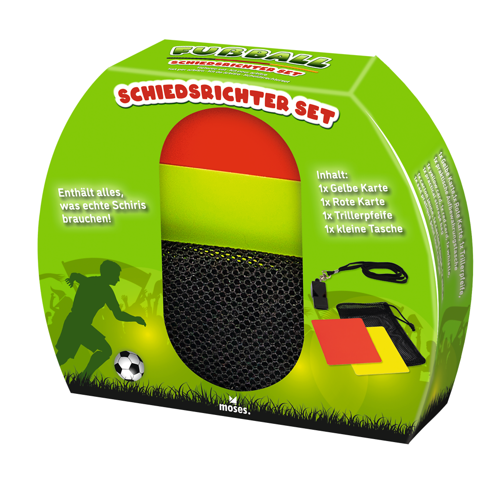 - enthält alles, was echte Schiris brauchen: Pfeife mit Band, gelbe und rote Karte