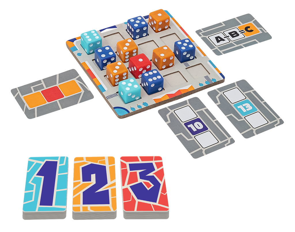 Aufgaben erfüllen: Auf der Hand halten alle Aufgabenkarten, die gewisse "Würfel-Formationen" auf dem Brett fordern. Wird eine Aufgabe erfüllt, kann die Karte ausgespielt und gewertet werden.