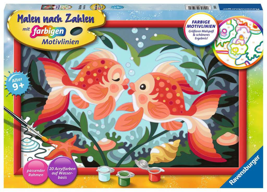 Farbige Motivlinien: Größerer Malspaß & ein schöneres Ergebnis!Dank der farbigen Motivlinien, können die Kinder das ganze Motiv Verliebte Fische und die Farben schneller erkennen. Der Pinsel hat eine gute Führung und so entsteht nach und nach ein perfektes Bild.Die schönen Motive zum Ausmalen sind eine tolle Geschenkidee für Kinder ab 9 Jahren und eine schöne Dekoration für das Kinderzimmer. In diesem Malset sind bereits 20 fertig gemischte Acrylfarben enthalten.Mit Malen nach Zahlen von Ravensburger lernen die Kinder Flächen sorgfältig auszumalen, ihr Maltalent zu verbessern sowie feinmotorische Fähigkeiten zu entwickeln. Am Ende stehen Freude, Stolz und ein Erfolgserlebnis, das die Lust am Weitermalen weckt.Die Motive sind altersgerecht in drei Schwierigkeitsstufen umgesetzt: von einfachen Bildern mit wenigen, großen Malflächen bis hin zu Bildern mit vielen, kleinen Malflächen für Fortgeschrittene.Jedes Malset enthält alles, was Künstler zum Malen brauchen und es ist kein Mischen der Farben notwendig.Das Ravensburger Malen nach Zahlen Programm bietet eine große Motivauswahl für Kinder und Erwachsene.