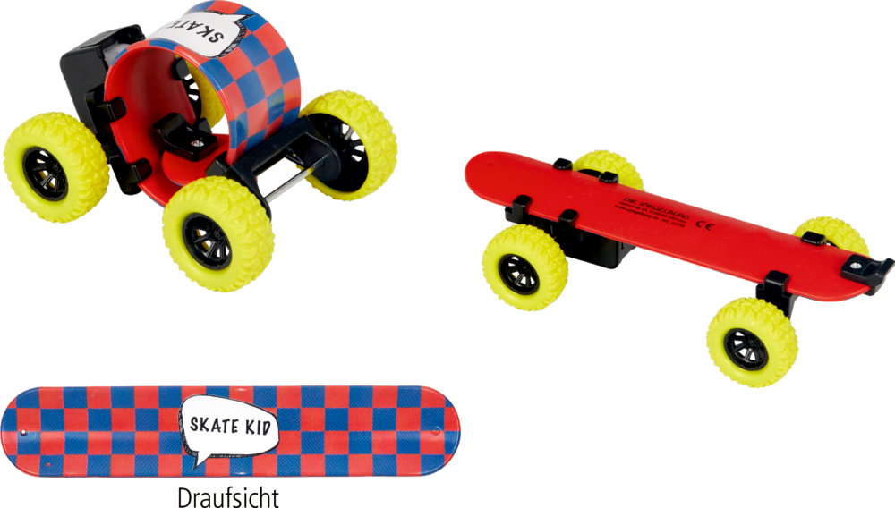 Einfach ans Handgelenk schnappen und Spaß haben! Das Skateboard-Schnapparmband - Bunte Geschenke von Die Spiegelburg rollt sich mit einem schnellen Schnapp-Effekt um den Arm und sitzt sicher. Mit ca. 15 x 3 x 3 cm aufgeklappt und ca. 8 x 6 x 6,5 cm zusammengeklappt passt es um jeden Arm und ist es ein cooler Blickfang am Handgelenk. In 2 Designs erhältlich.