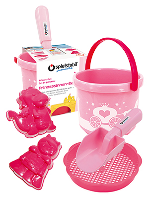 Als Prinzessin den Sandkasten oder Strand erobern macht gleich noch mehr Spaß. Passend eingefärbt, in rosa und pink, kann mit dem stabilen Eimerchen, dem Sieb und der Schaufel gebuddelt und gebaut werden. Die beiden Sandförmchen zaubern prinzessinnenhafte Figuren in den Sand.