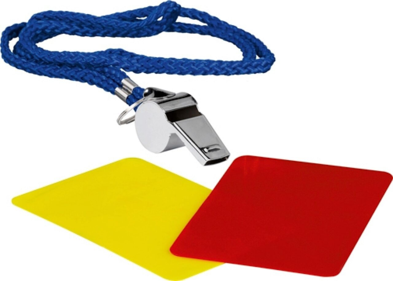 Für große und kleine Schiedsrichter und Trainer. Trillerpfeife mit Kordel, 4,5 cm groß. Inklusive gelber und roter Kunststoff-Karte, 12 cm groß