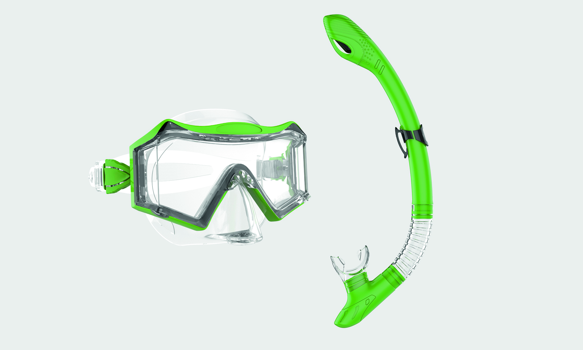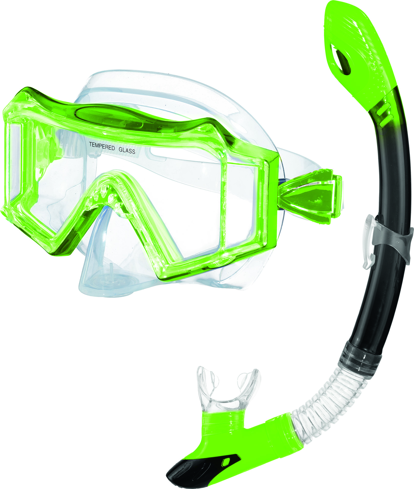 Maske mit extra-großem Sichtfeld. Schnorchel aus Silikon, mit Auslassventil. Super Passform.
